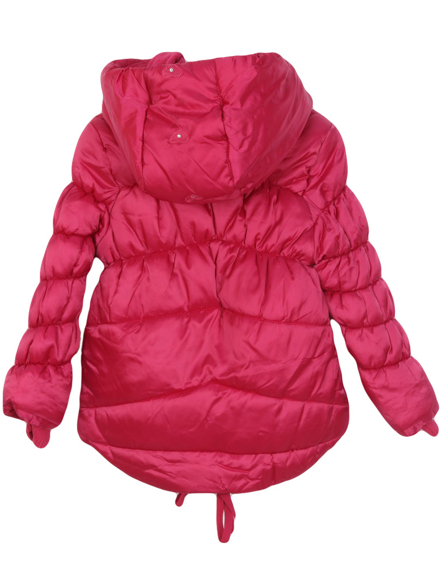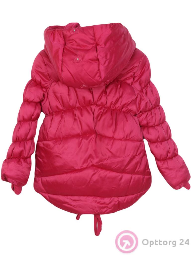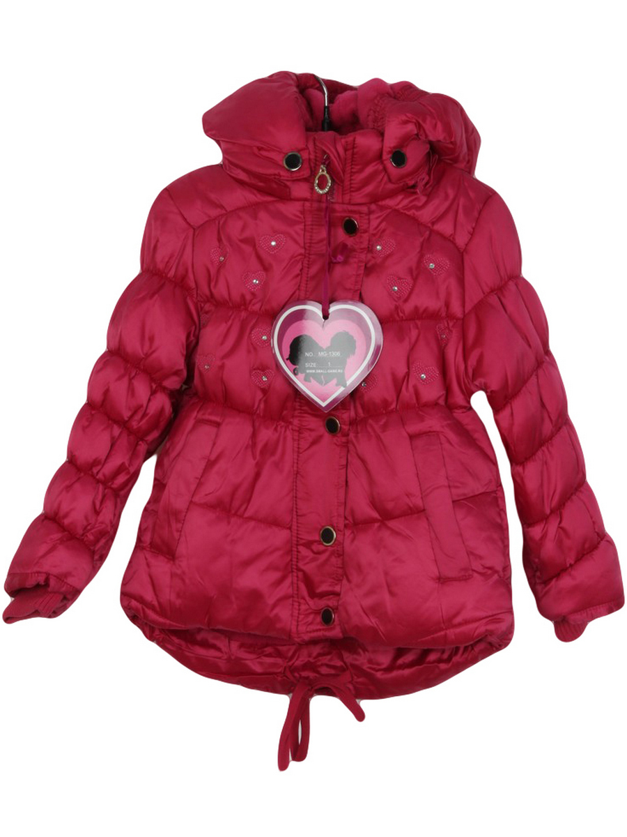 Демисезонная куртка для девочек модного малинового цвета с капюшоном без меха и большими карманами. Застежка на молнии и кнопках. Верх изделия украшен стразами. Капюшон украшен сердечками.