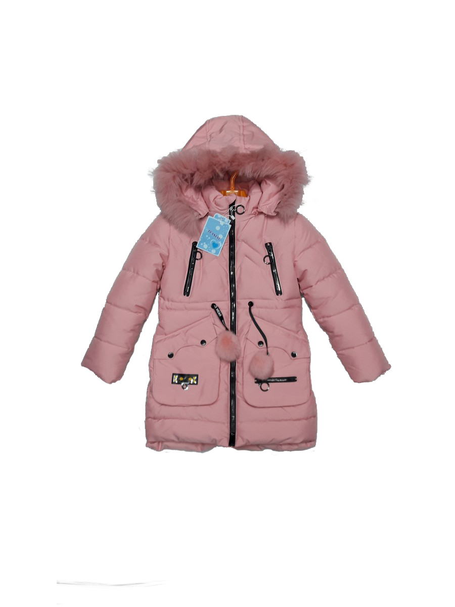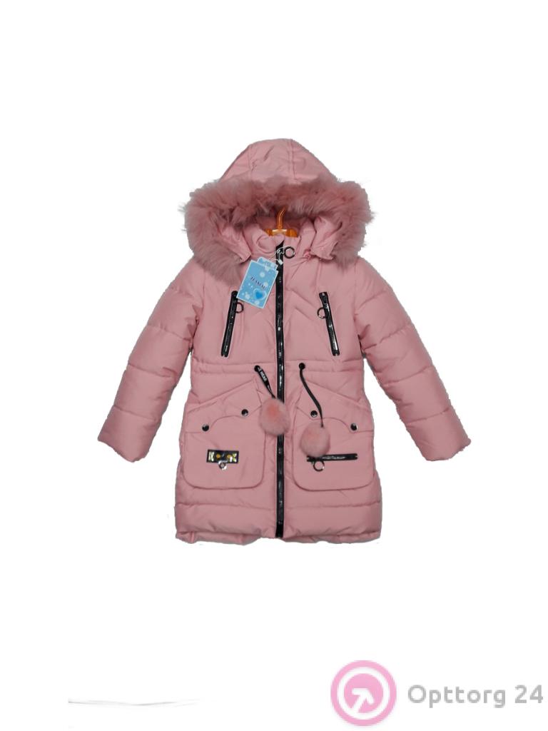 Куртка для девочки розового цвета с поясом, капюшон украшен мехом в цвет. По бокам расположены вместительные карманы.