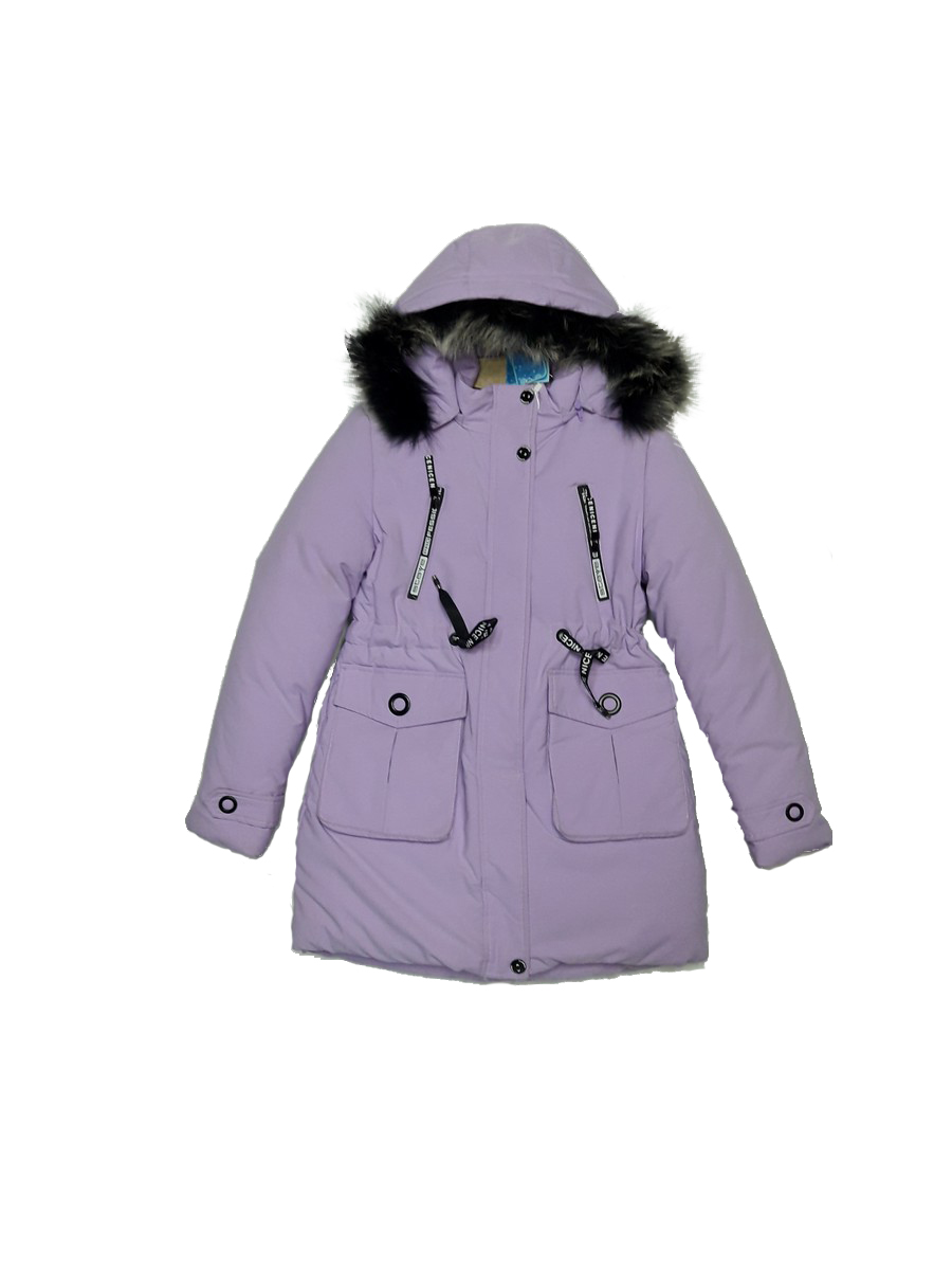 Куртка для девочки нежного сиреневого цвета. По центру-молния. Капюшон с мехом в цвет.