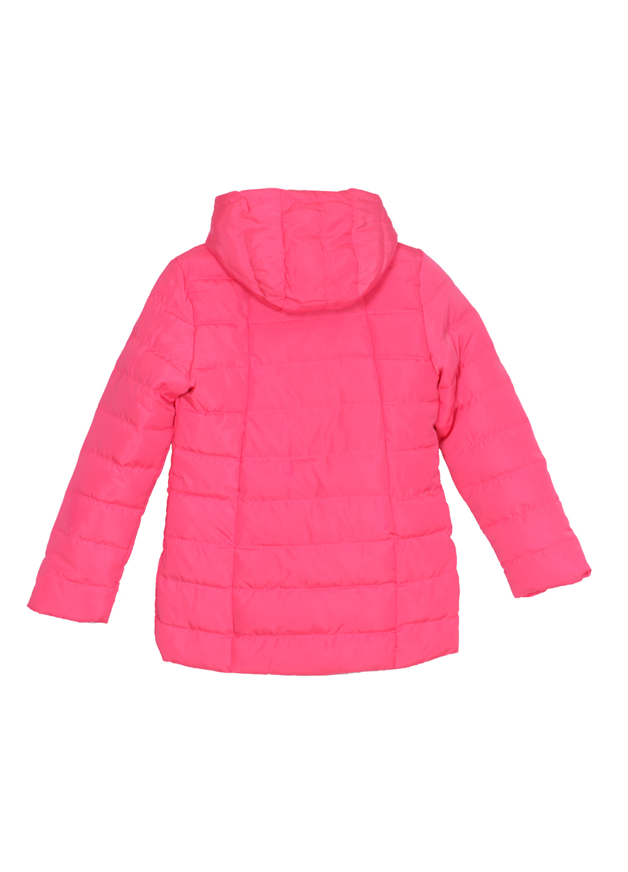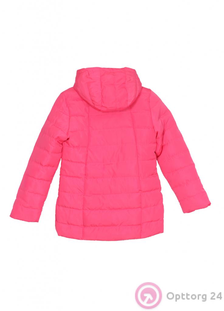 Очень яркая и привлекающая внимание куртка для девочки розового цвета. Имеет удлиненный сзади крой, карманы и декоративные пуговицы колоритного черного цвета и капюшон