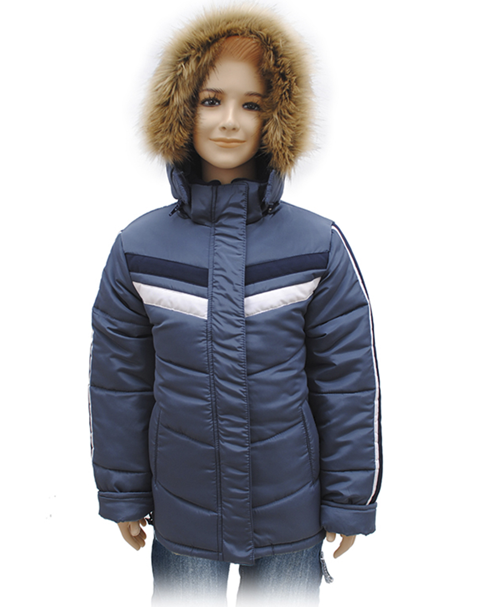 Замечательная утепленная куртка для мальчика. В модели предусмотрен капюшон, который украшен исскуственным мехом.