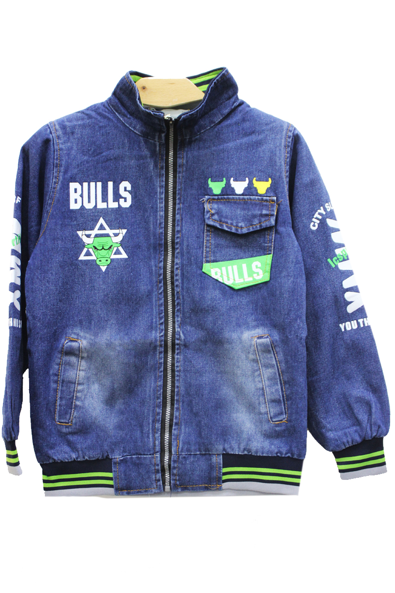 Описание: Куртка для мальчика демисезонная джинсовой с изображением быка. Молния серая, есть карманы. Рукава на резинках.