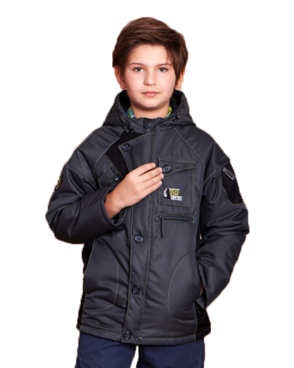 Куртка серая для мальчика с черными вставками и зеленой строчкой. Оригинальный крой и стильные нашивки - отличительные особенности данной модели. Отлично подойдет как для веселых игр и прогулок, так и для повседневных походов в школу и кружки.