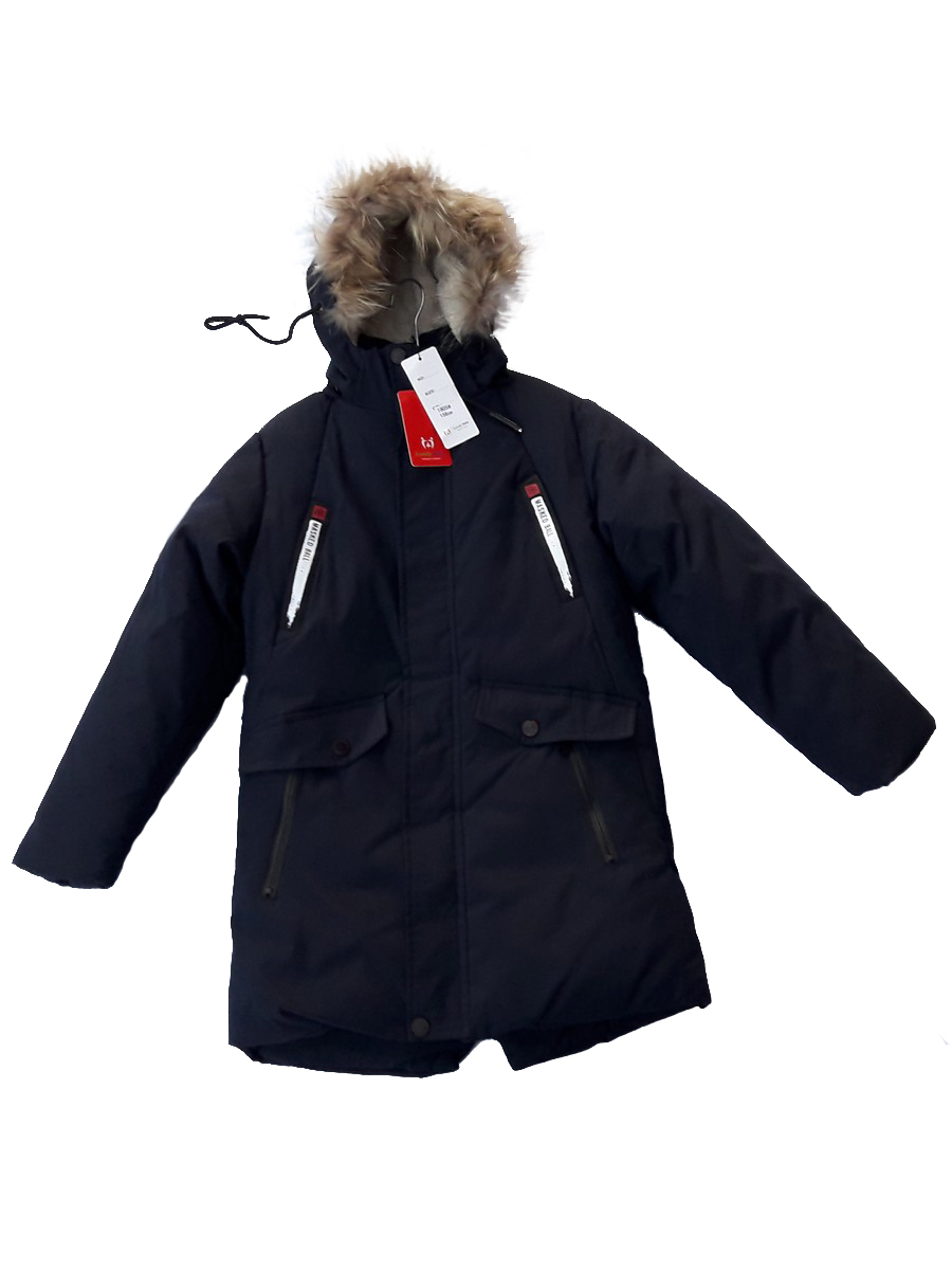 Теплая зимняя куртка для мальчика темно-синего цвета. Есть карманы и капюшон (натуральный мех).