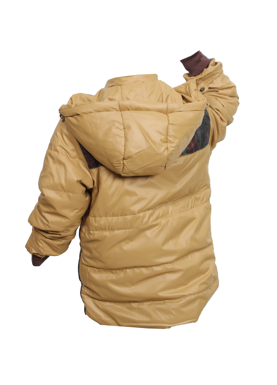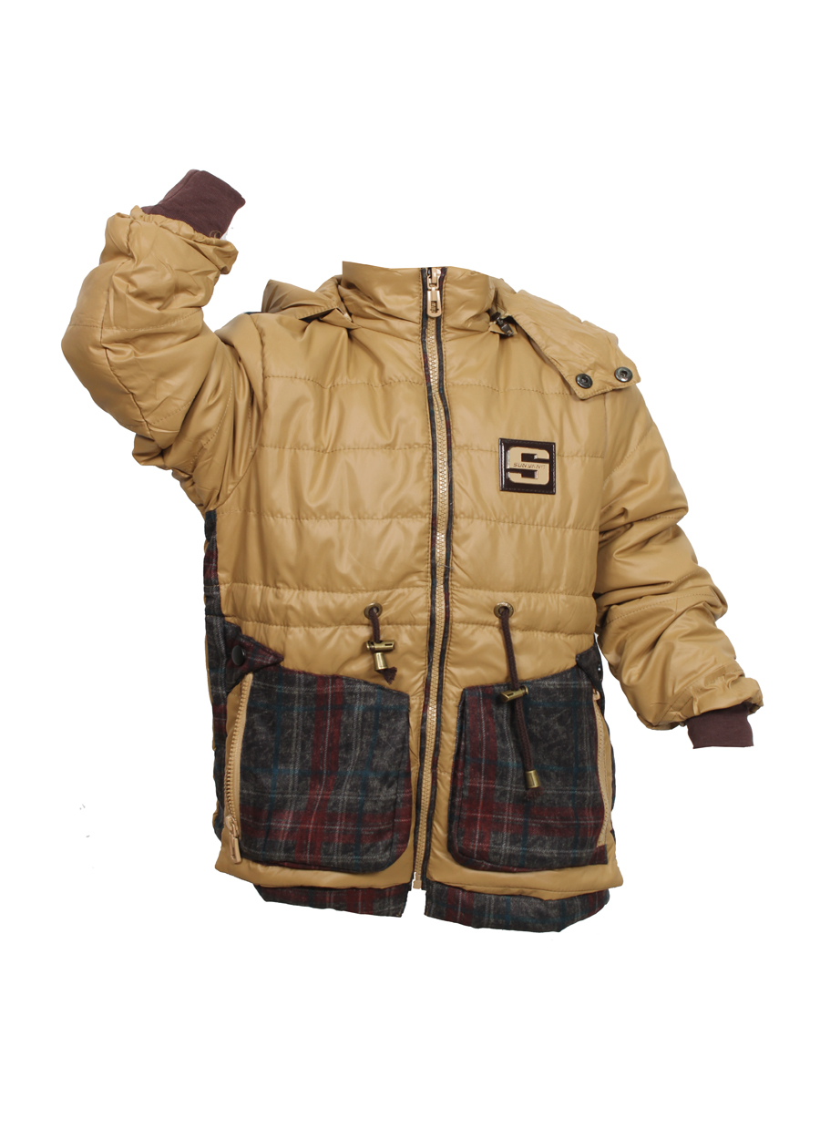 Весеняя куртка коричневого цвета для мальчика с модными тканевыми вставками в клеточку. Изделие имеет пояс-заятжки и большой капюшон