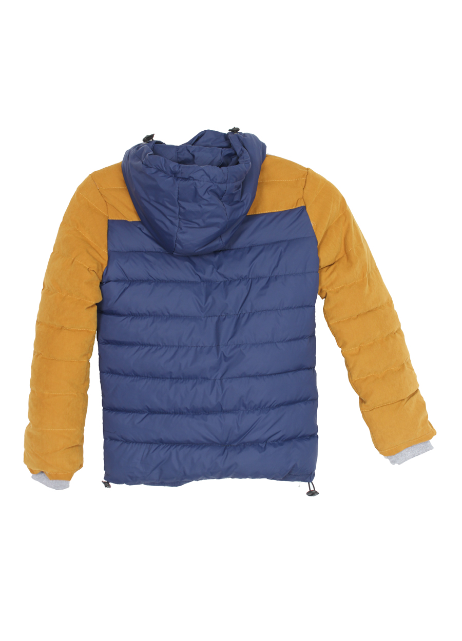Симпотичная куртка для мальчика коричневого цвета с синими вставками. Изделие отличается возможностью "стянуть" куртку по талии, утепленными рукавами и удобными карманами