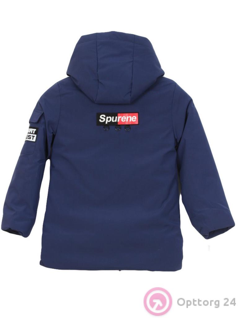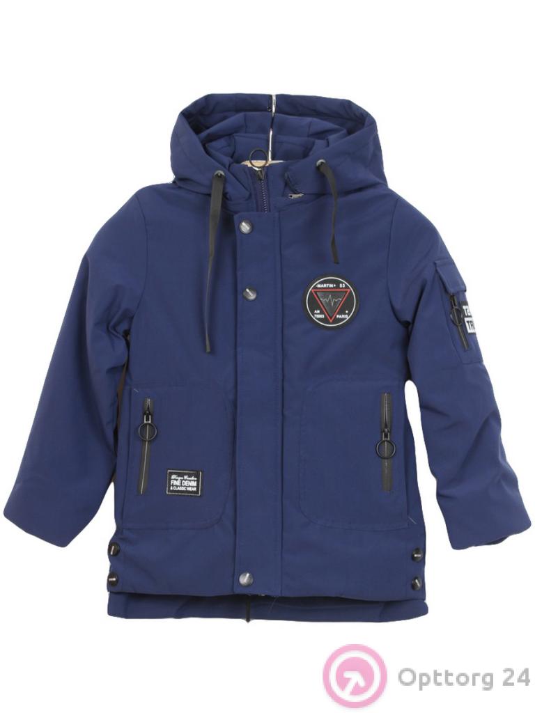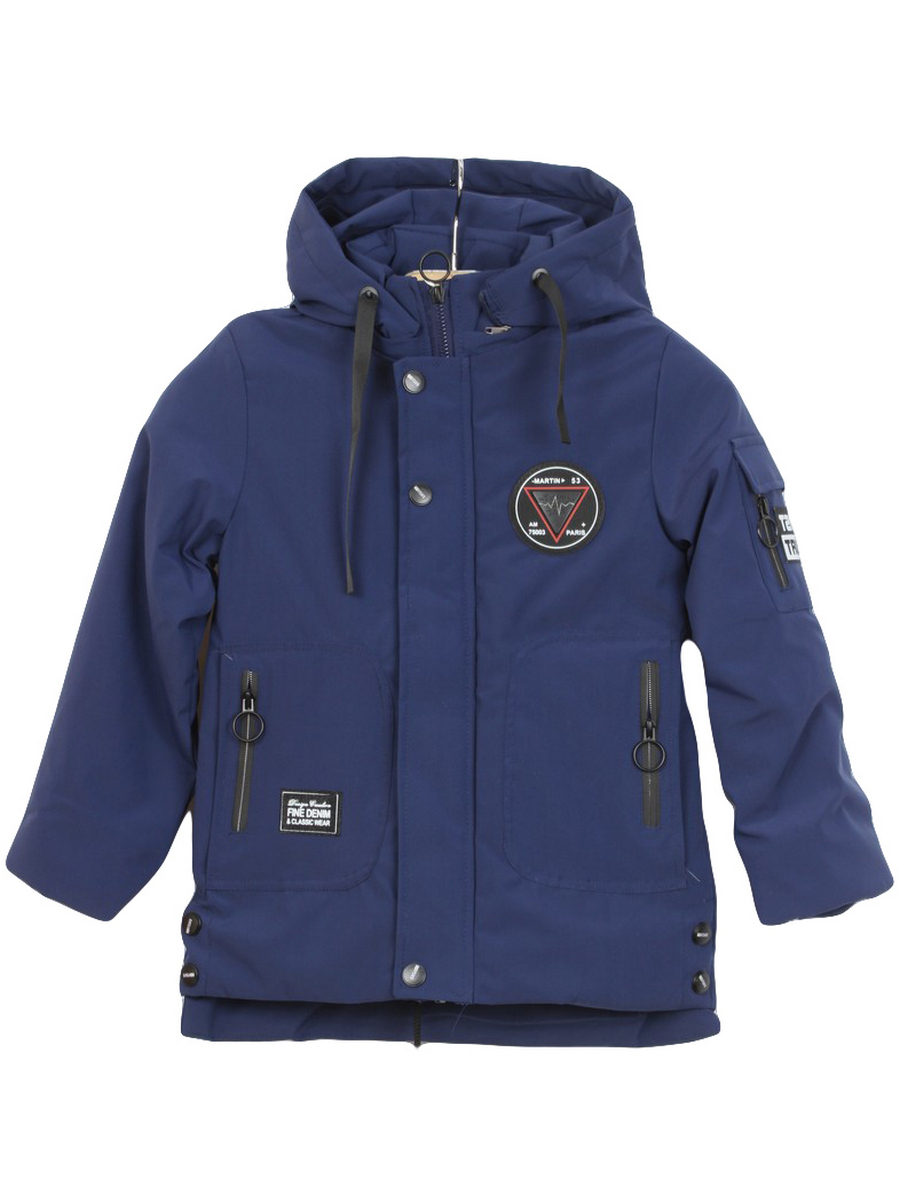 Демисезонная куртка для мальчика подростковая синего цвета длиной выше колена. Модель с капюшоном, по середине - застежка-молния. Изделие спереди с 2 большими карманами.