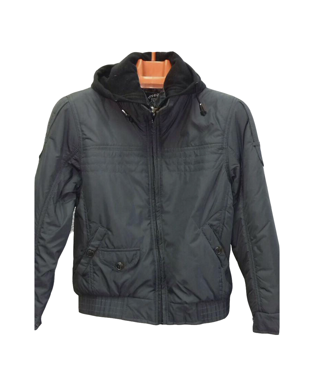 Темно-серая куртка с трикотажным капюшоном, который можно стянуть при необходимости. Спереди есть карманы на заклепках.