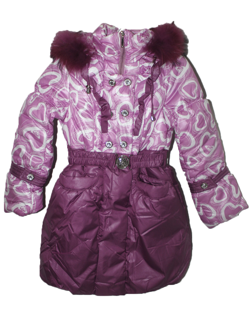 Детское пальто для девочки фиолетового цвета верхня часть полностью покрыта принтом в виде сердец. Пояс не позволит ветру задувать под пальто.