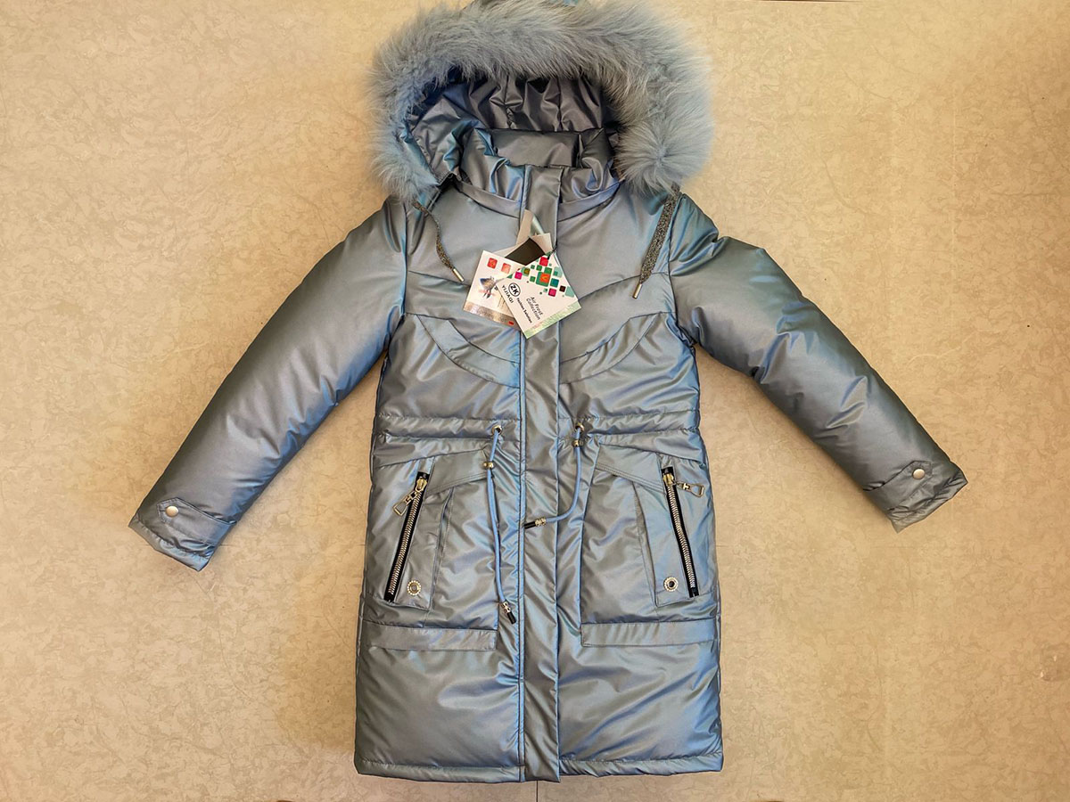 Описание: Пальто зимнее детское для девочки стального цвета.