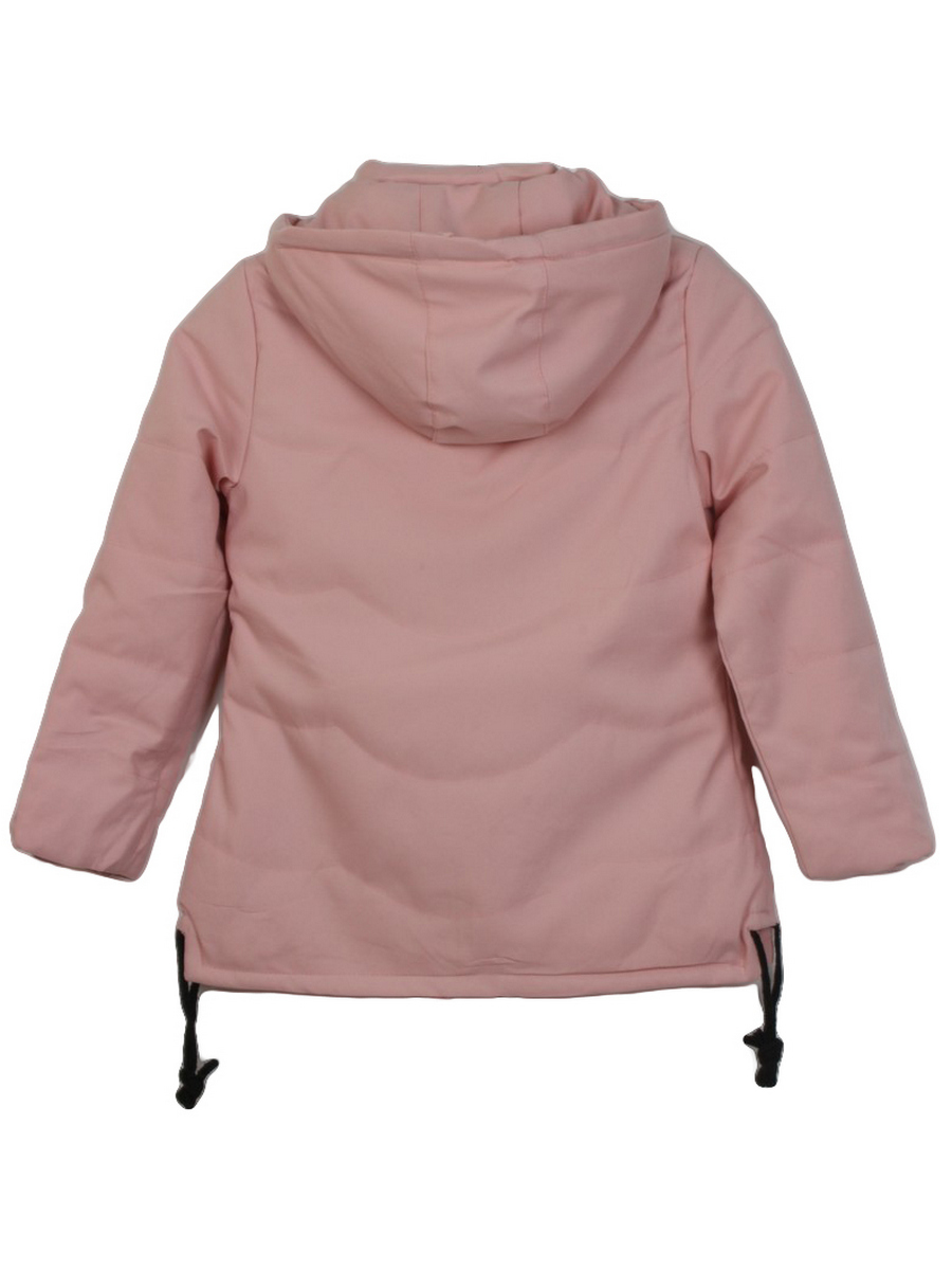 Розовая парка для девочек с капюшоном без меха, карманами и черной молнией. Снизу изделия завязки. Модель декорирована надписью.