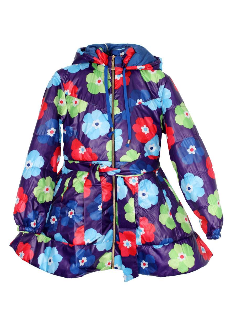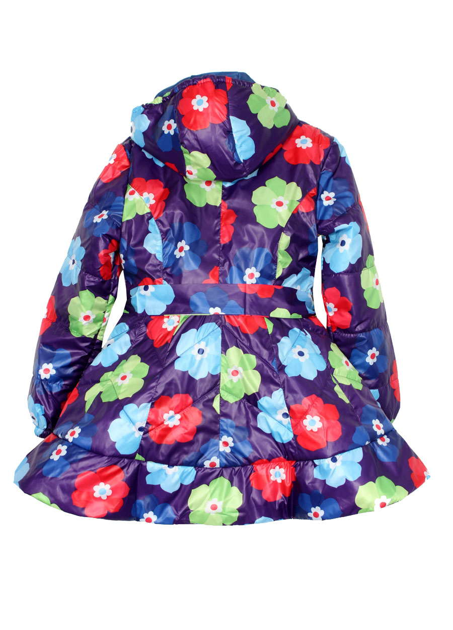 Симпотичный фиолетовый плащ для девочки. По всей площади изделия нанесен цветочный принт, капюшон имеет стильные завязки. В комплекте идет пояс под цвет плаща