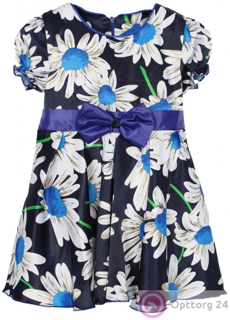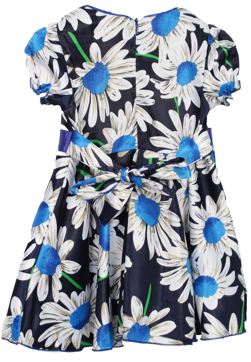 Синее платье с узором в виде цветов по всей площади изделия. Застегивается на молнию сзади, а так же имеет пояс