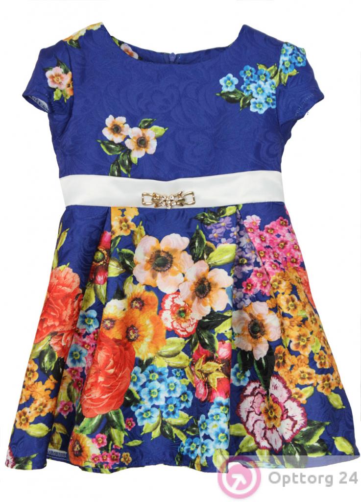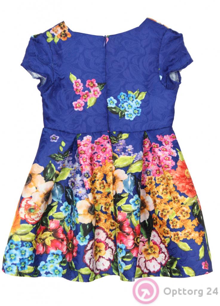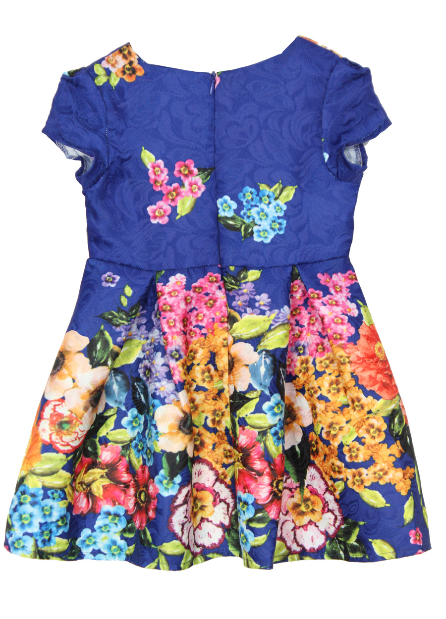 Детское платье синего цвета с узором в виде россыпи цветов. Имеет застежку на задней части