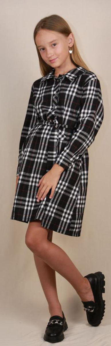 Описание: Платье для девочки из хлопка с поясом, черного цвета. Отложенный воротничок. Застежка спереди на пуговицах.