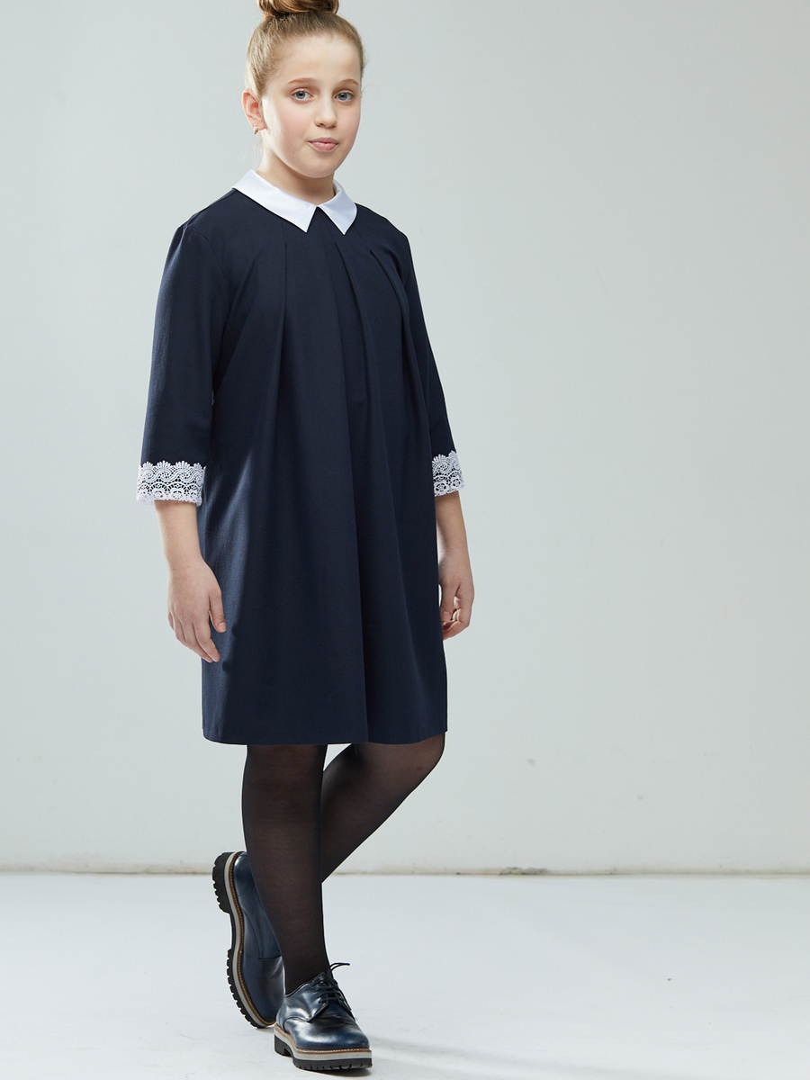 Платье синего цвета для девочек с воротником свободного кроя. Изделие имеет круглый вырез, рукава 3/4, украшенные белым кружевом.