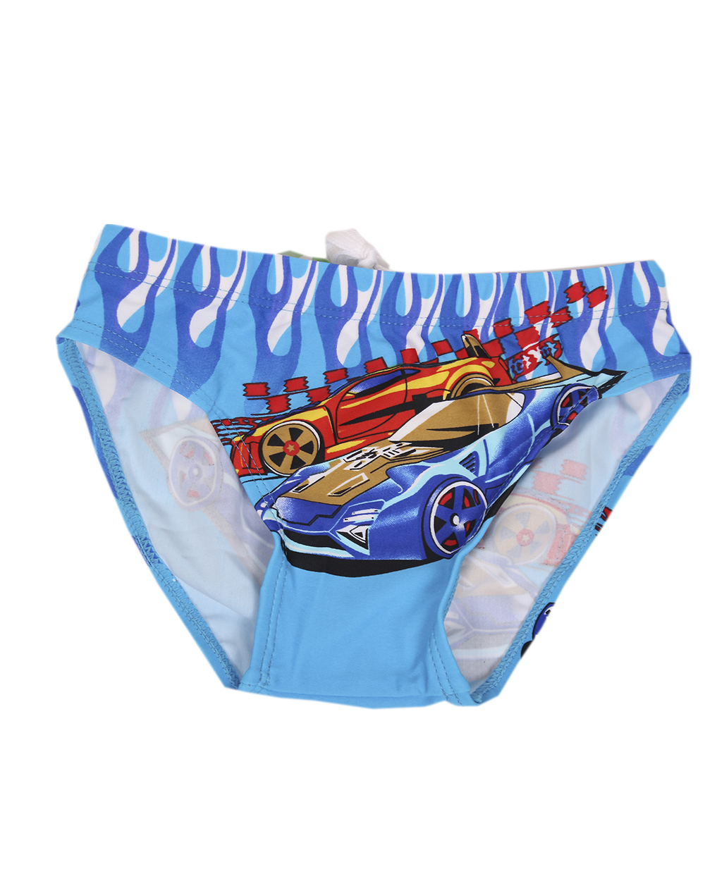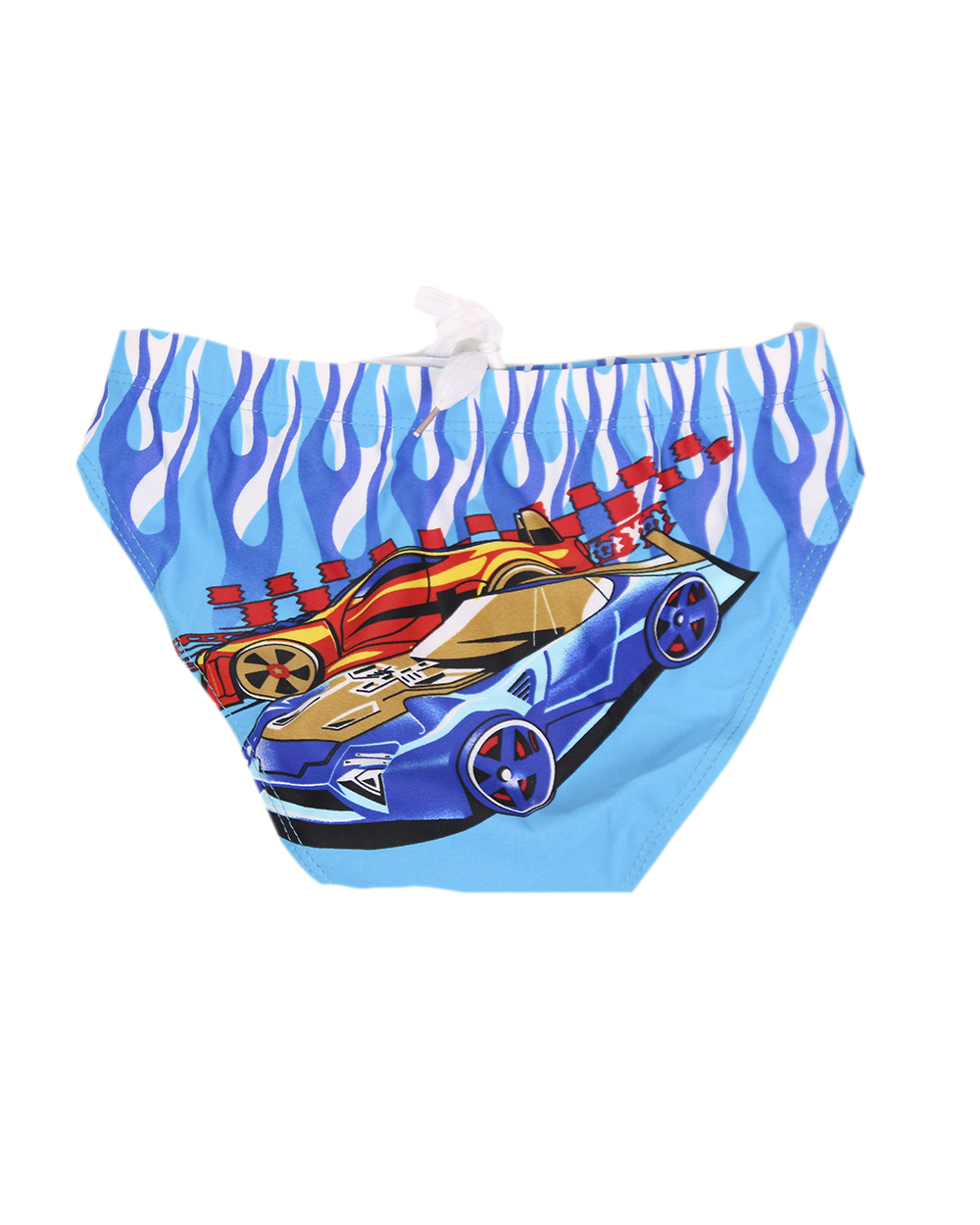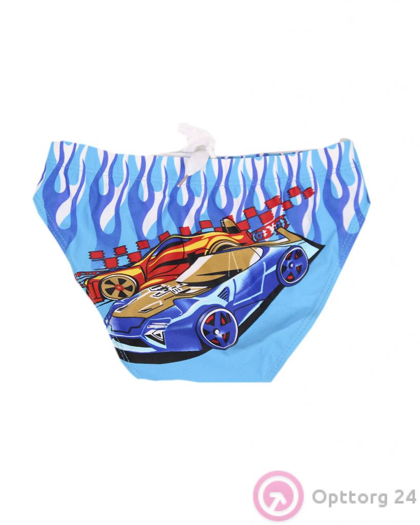 Удобные детские плавки-трусики яркого голубого цвета. Изделие украшено рисунком тачек спереди и сзади.