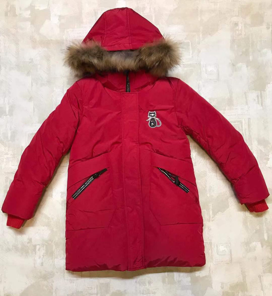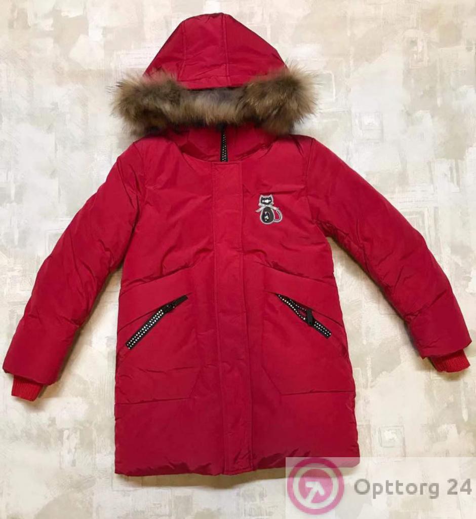 Описание: Пуховик детский для девочки красного цвета с принтом киски.