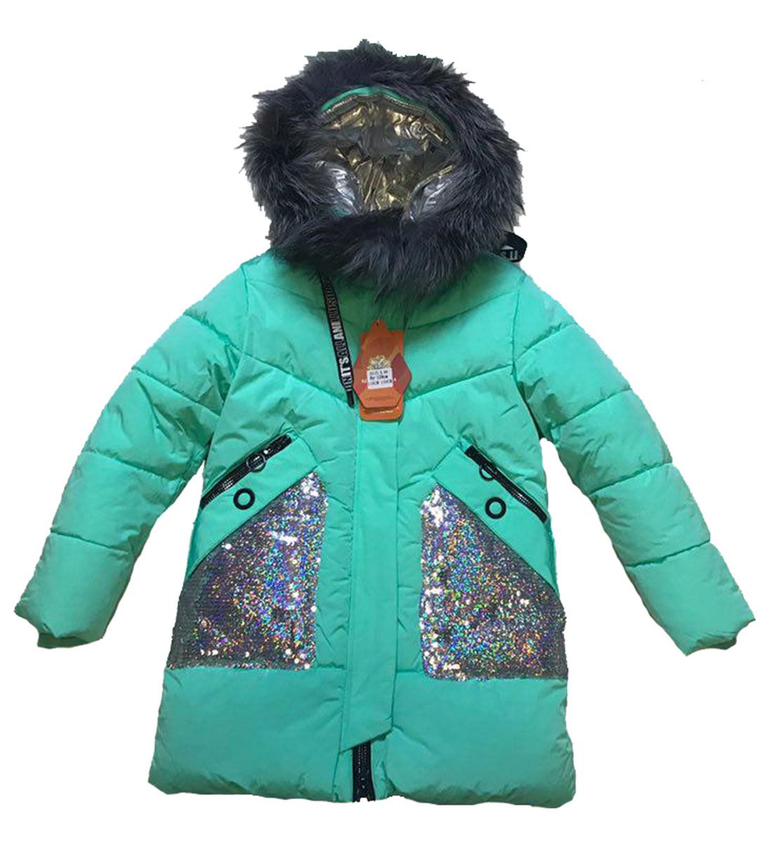 Описание: Пуховик детский для девочки бирюзового цвета с блестящими вставками. Капюшон декорирован натуральным мехом. Застежка на молнии с ветрозащитной планкой. Есть два кармана на молнии.