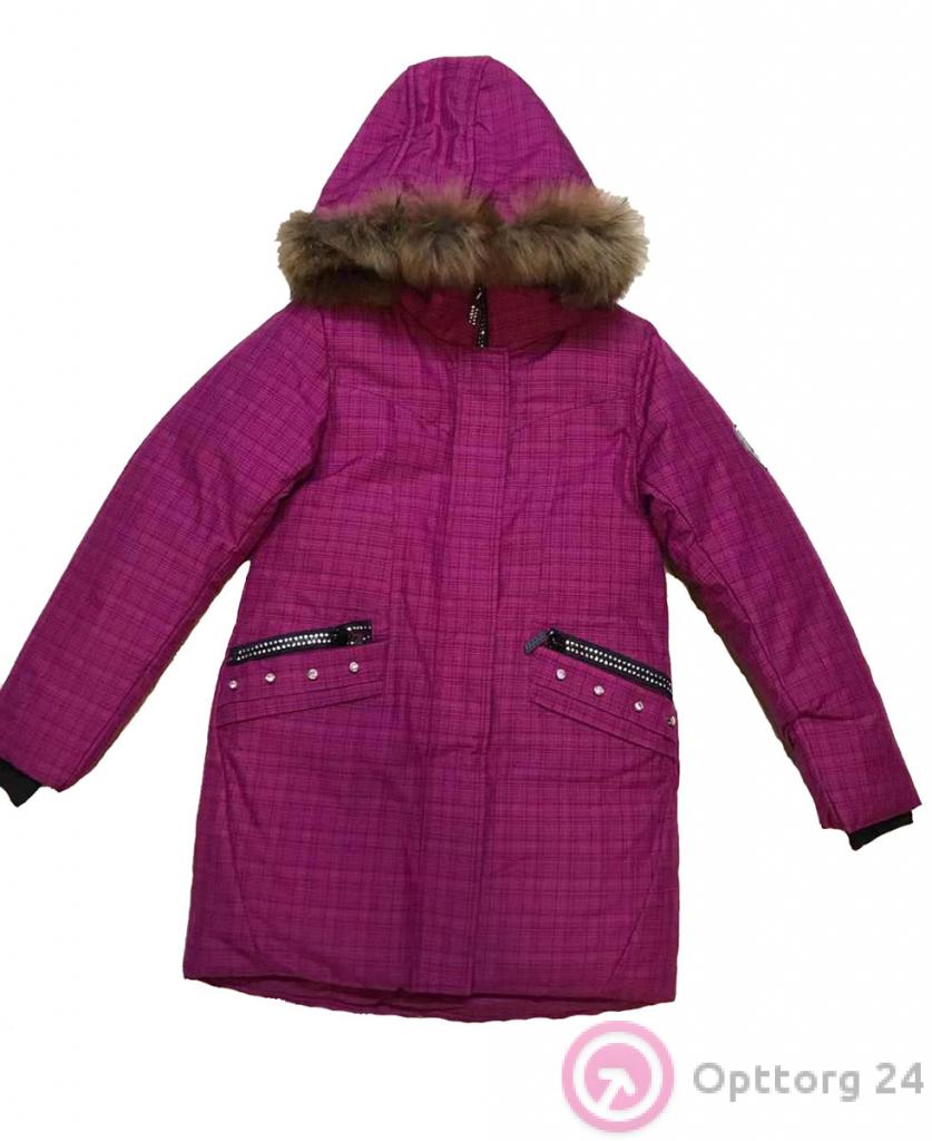 Пуховик детский для девочки малинового цвета в клеточку оптом