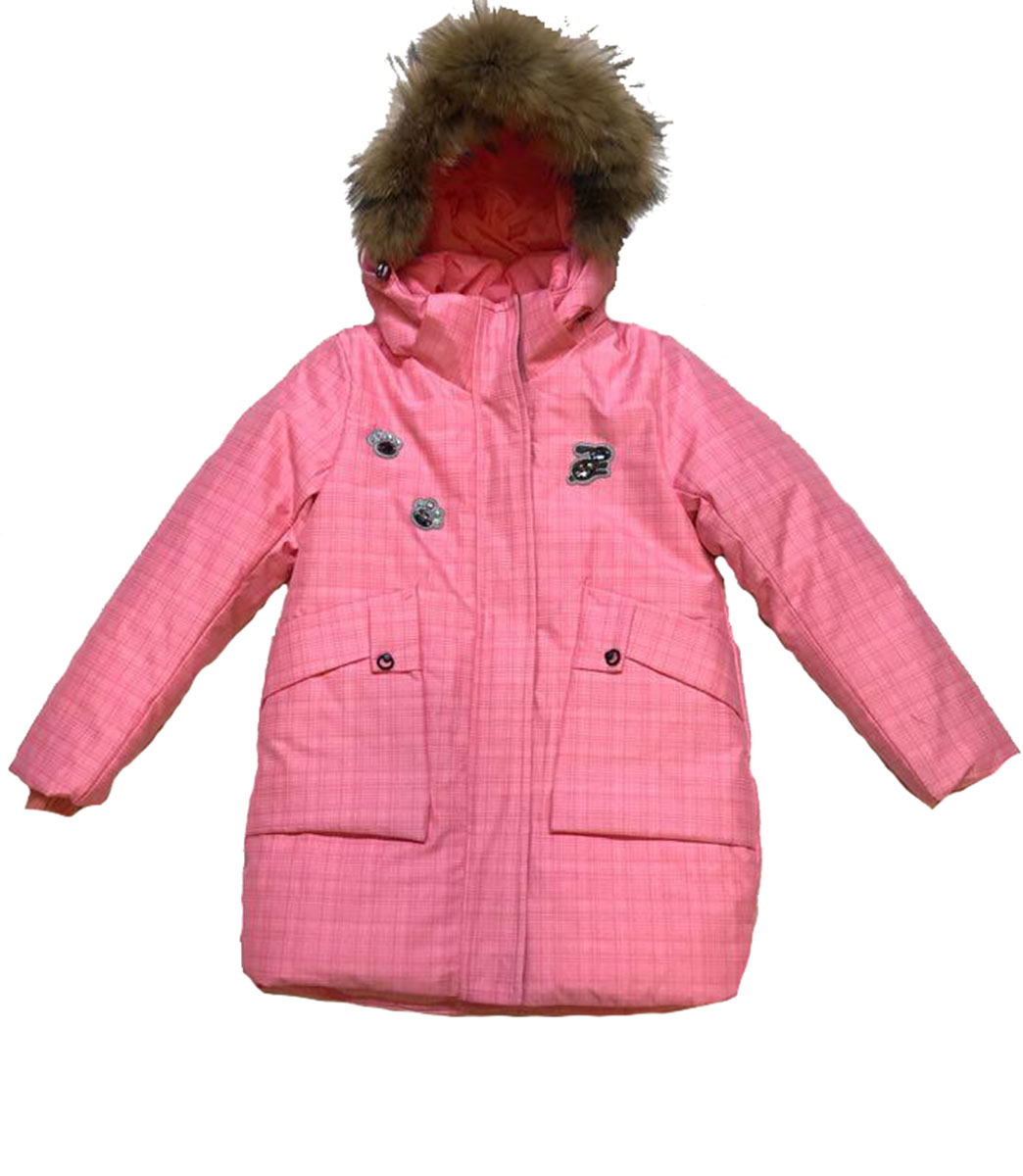 Описание: Пуховик детский для девочки кораллового цвета с накладными карманами. На груди принт зайки. Капюшон декорирован натуральным мехом. Застежка на молнии с ветрозащитной планкой.
