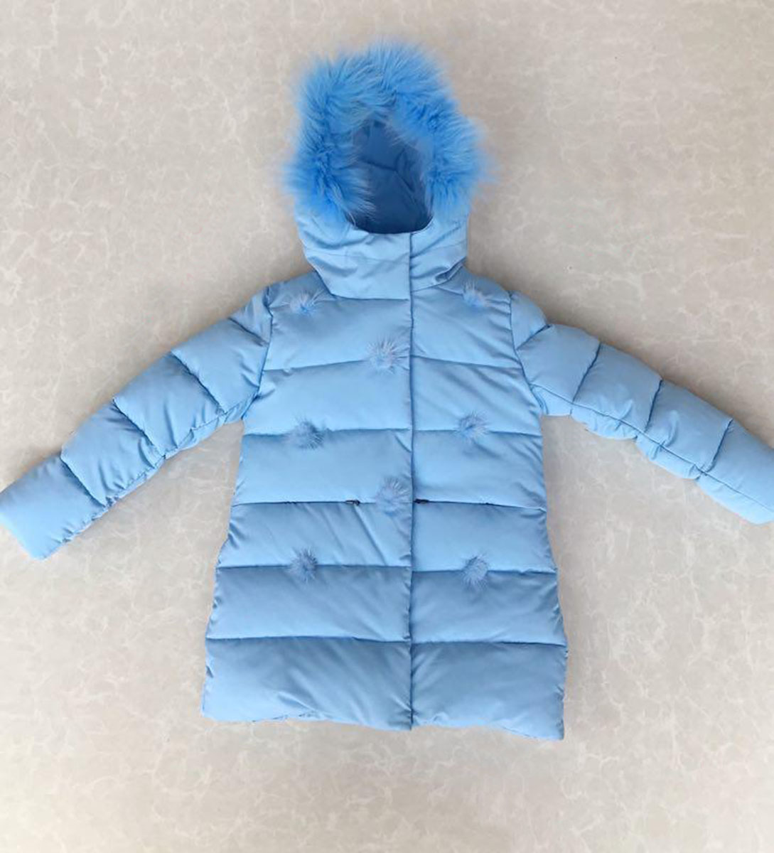 Описание: Пуховик детский для девочки нежно-голубого цвета с помпончиками из натурального меха. Капюшон декорирован натуральным мехом. Застежка на молнии с ветрозащитной планкой. Высокий воротник.
