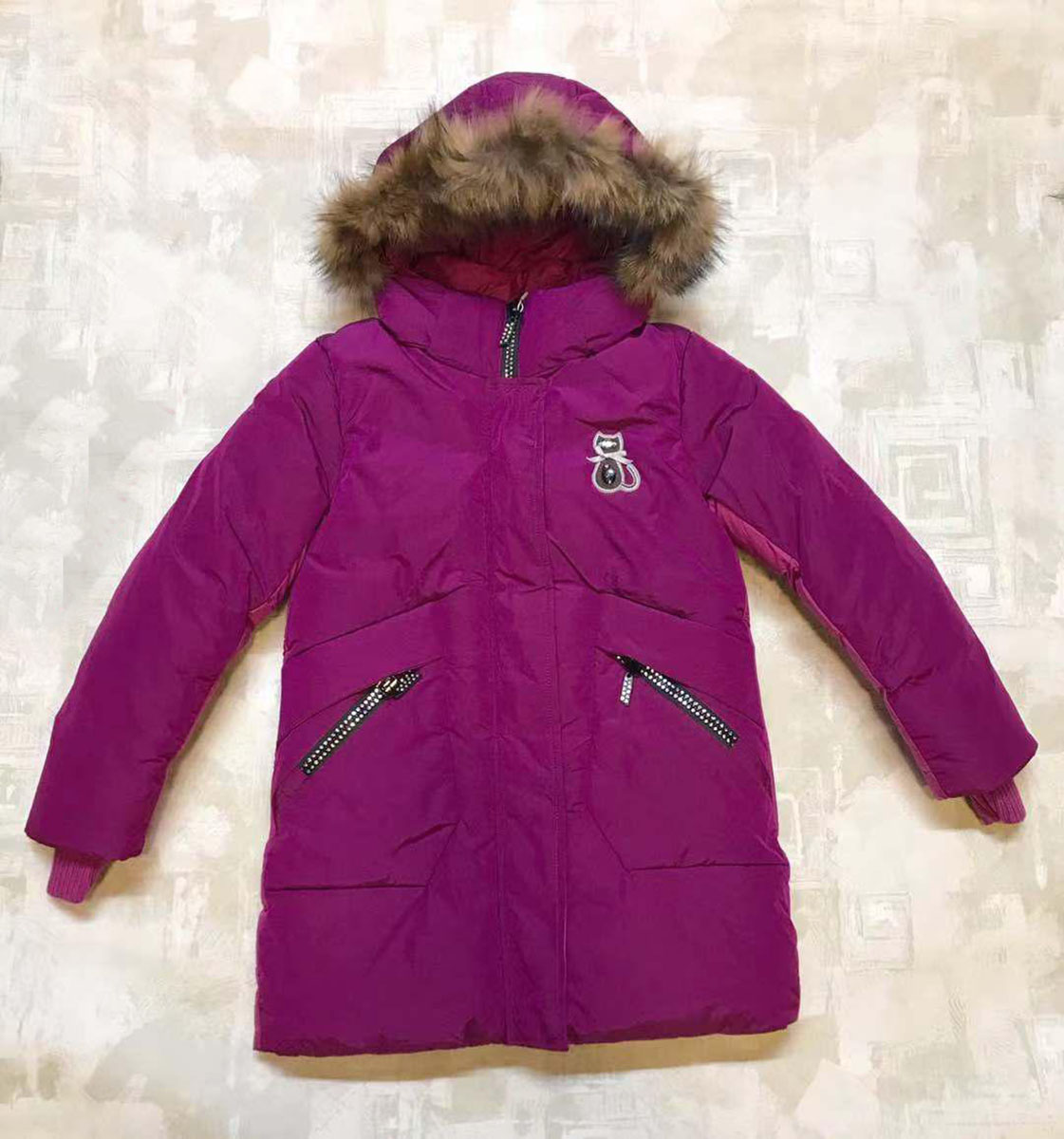 Описание: Пуховик детский для девочки сиреневого цвета с принтом киски.