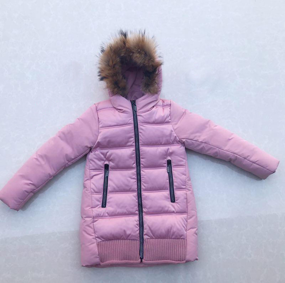 Описание: Пуховик детский для девочки с трикотажной вставкой, простроченный, однотонный, розового цвета. Капюшон декорирован натуральным мехом. Застежка на молнии. Есть два кармана на молнии.