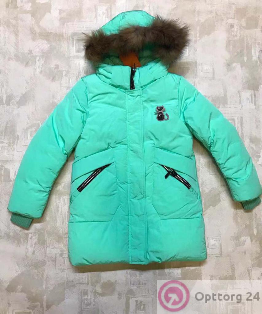 Описание: Пуховик детский для девочки бирюзового цвета с принтом киски.