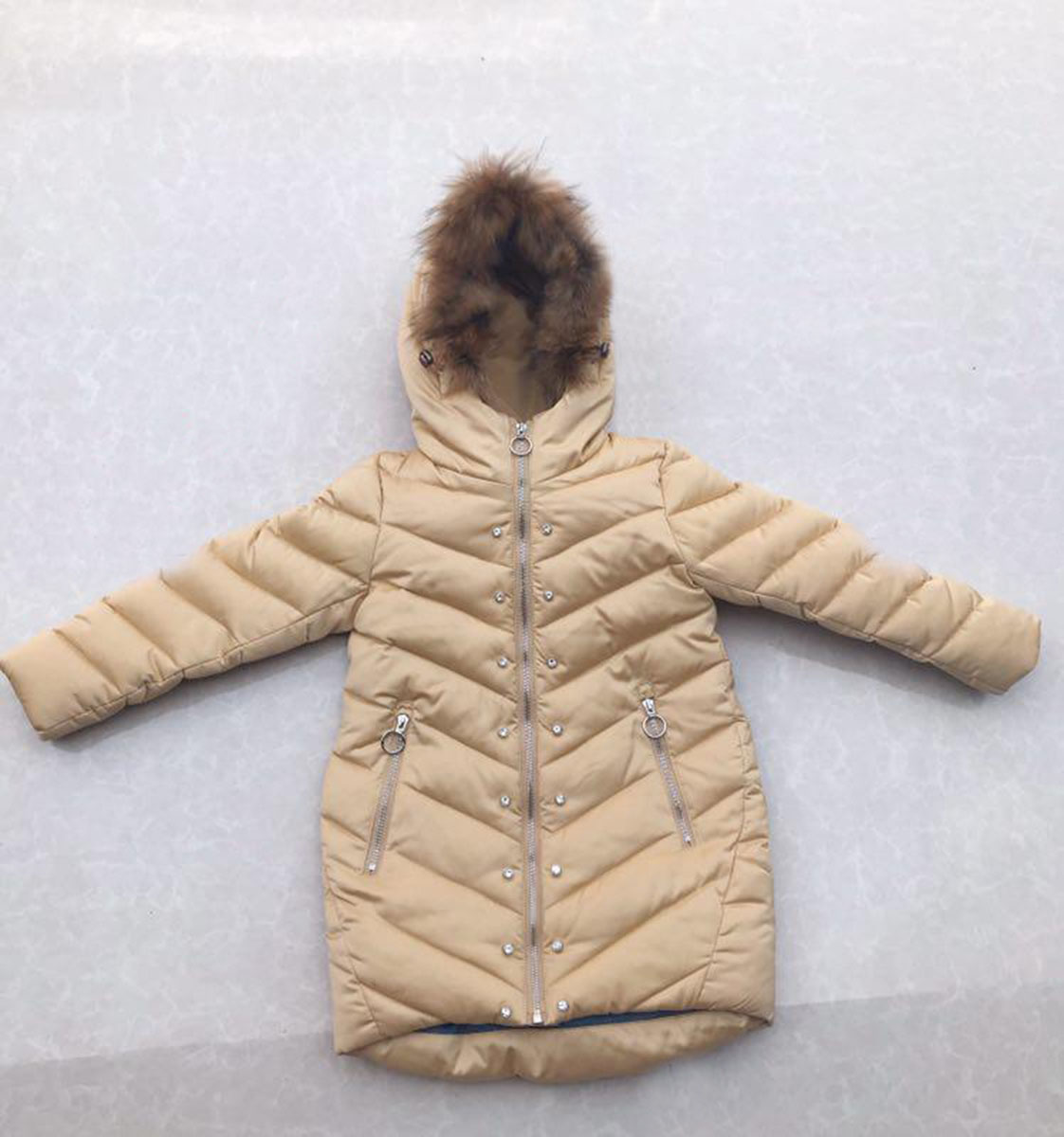 Описание: Пуховик детский для девочки, простроченный, однотонный, золотого цвета. Пуховик декорирован искусственными камнями. Капюшон декорирован натуральным мехом. Застежка на молнии. Есть два кармана на молнии. Высокий воротник.
