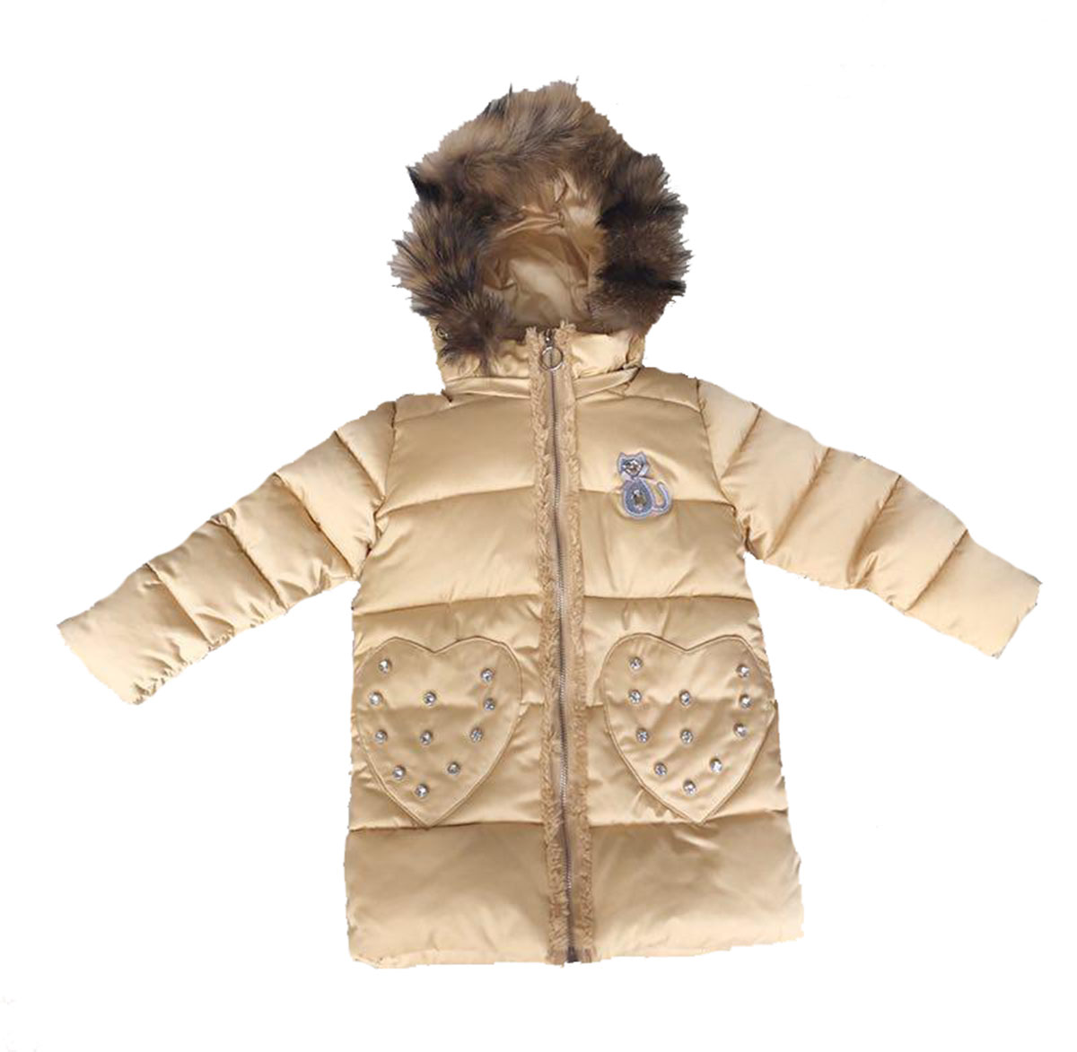 Описание: Пуховик детский для девочки золотого цвета, удлиненный. С принтом сердечек. Капюшон декорирован натуральным мехом. Застежка на молнии. Высокий воротник.
