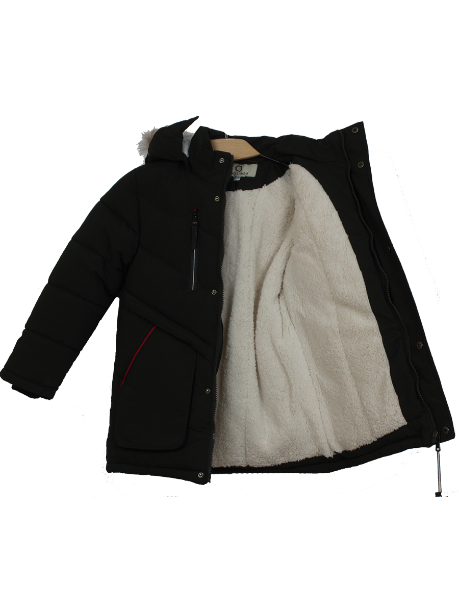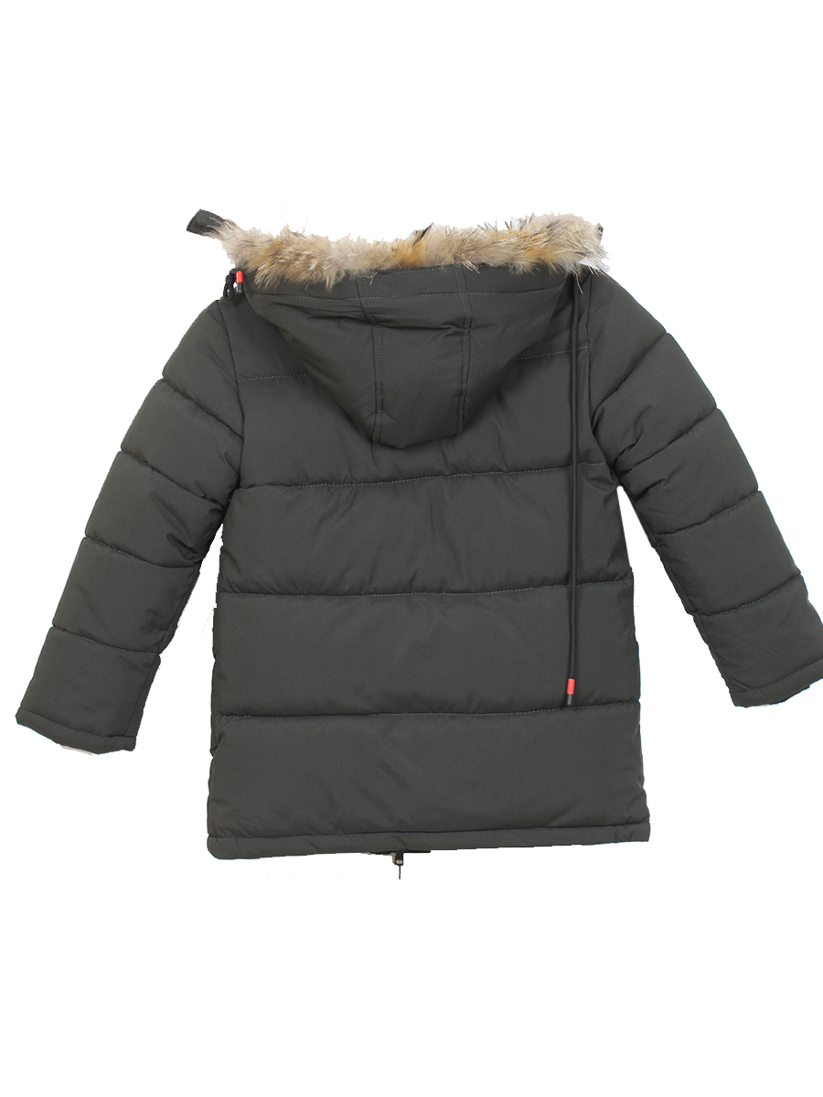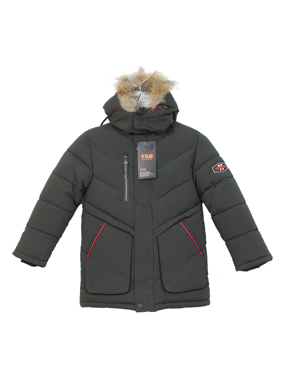 Пуховик для мальчика с подкладом зимний с натуральным мехом. Есть карманы и капюшон. Стиль современный. Цвет болотный с красными вставками.
