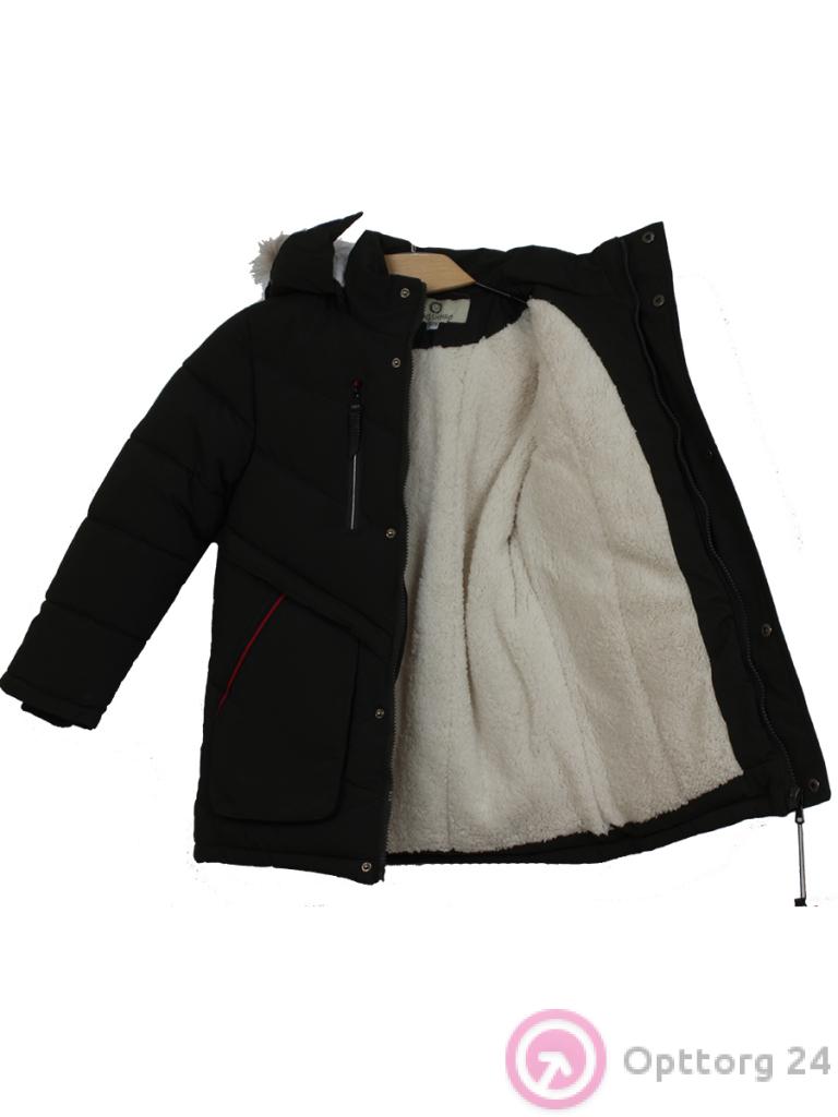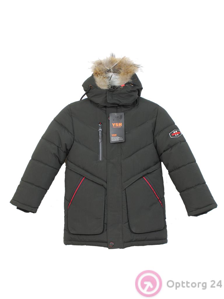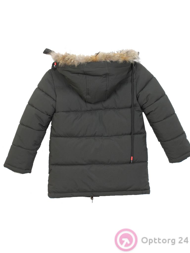 Пуховик для мальчика с подкладом зимний с натуральным мехом болотная с красными вставками оптом