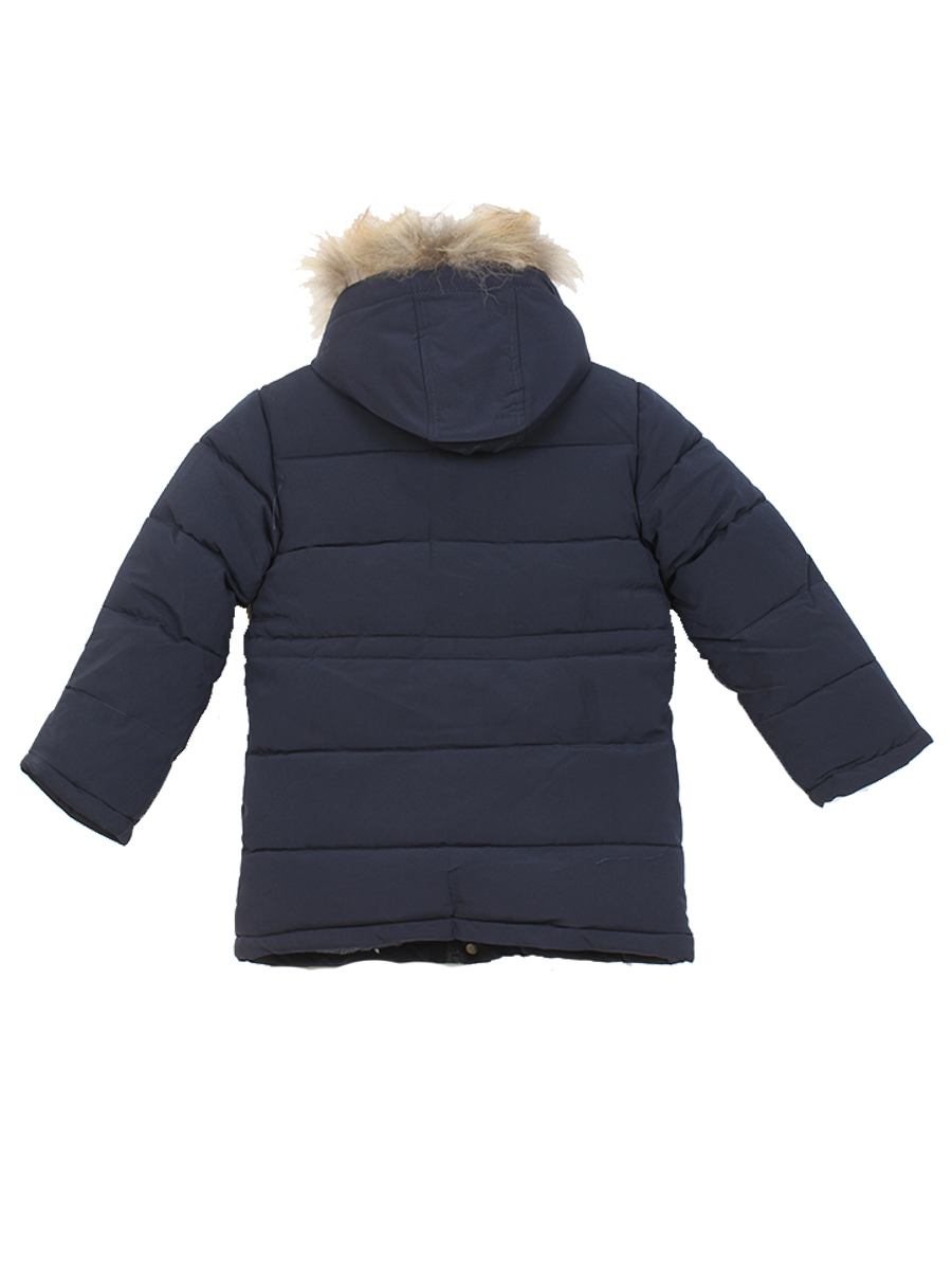 Пуховик для мальчика с подкладом зимний с натуральным мехом. Есть карманы и капюшон. Стиль современный. Цвет темно-синий.