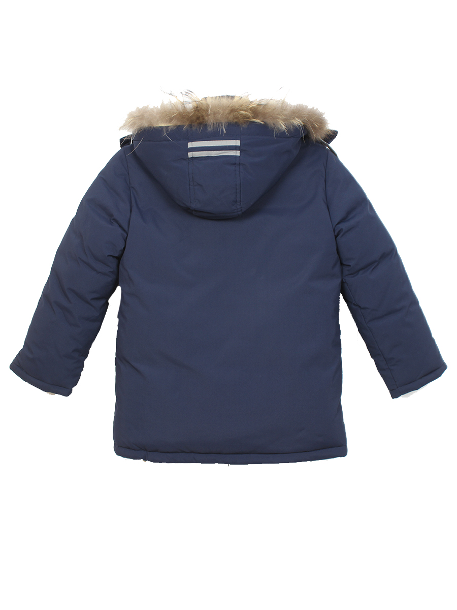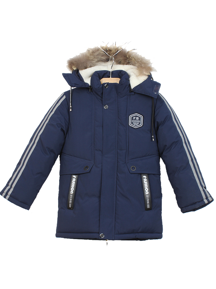 Пуховик для мальчика с подкладом зимний с натуральным мехом. Есть карманы и капюшон. Стиль современный. Цвет темно-синий с серыми полосками.