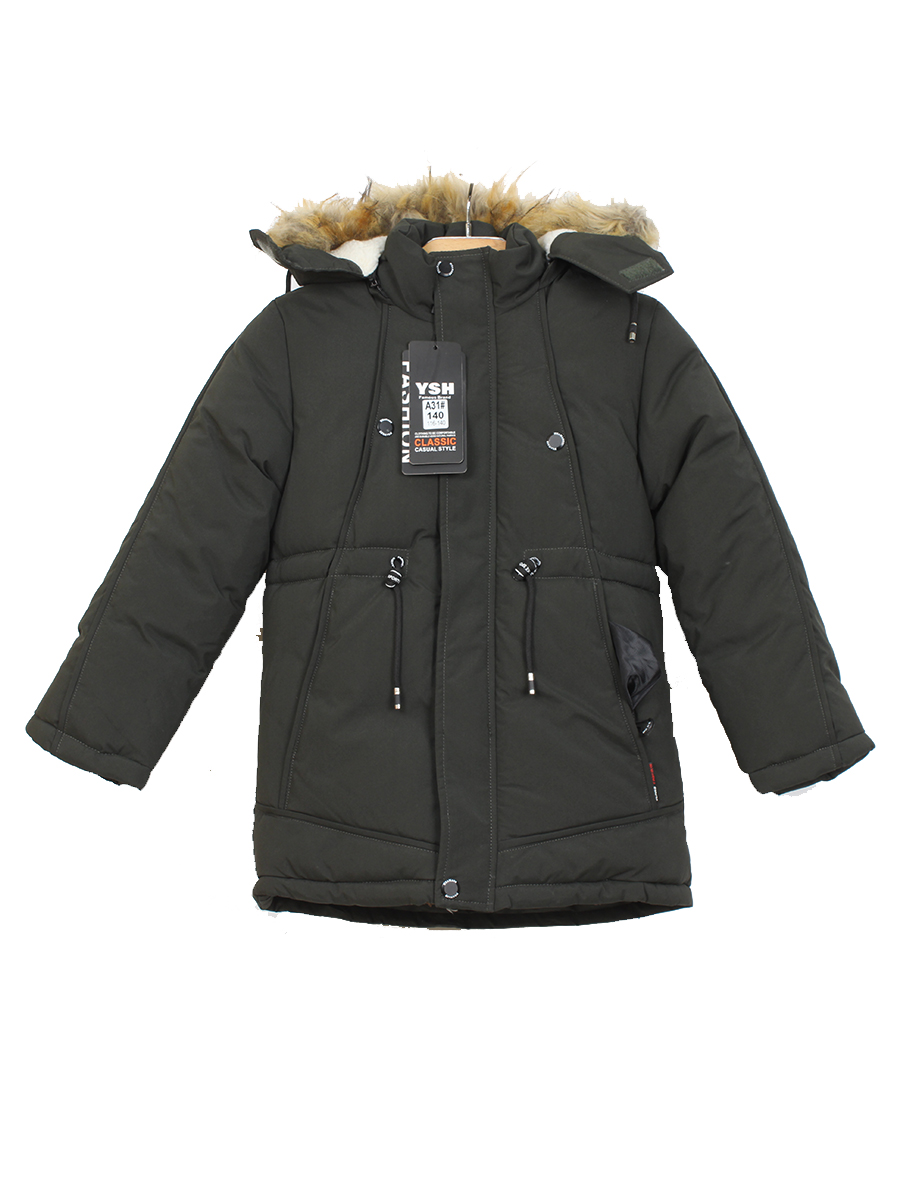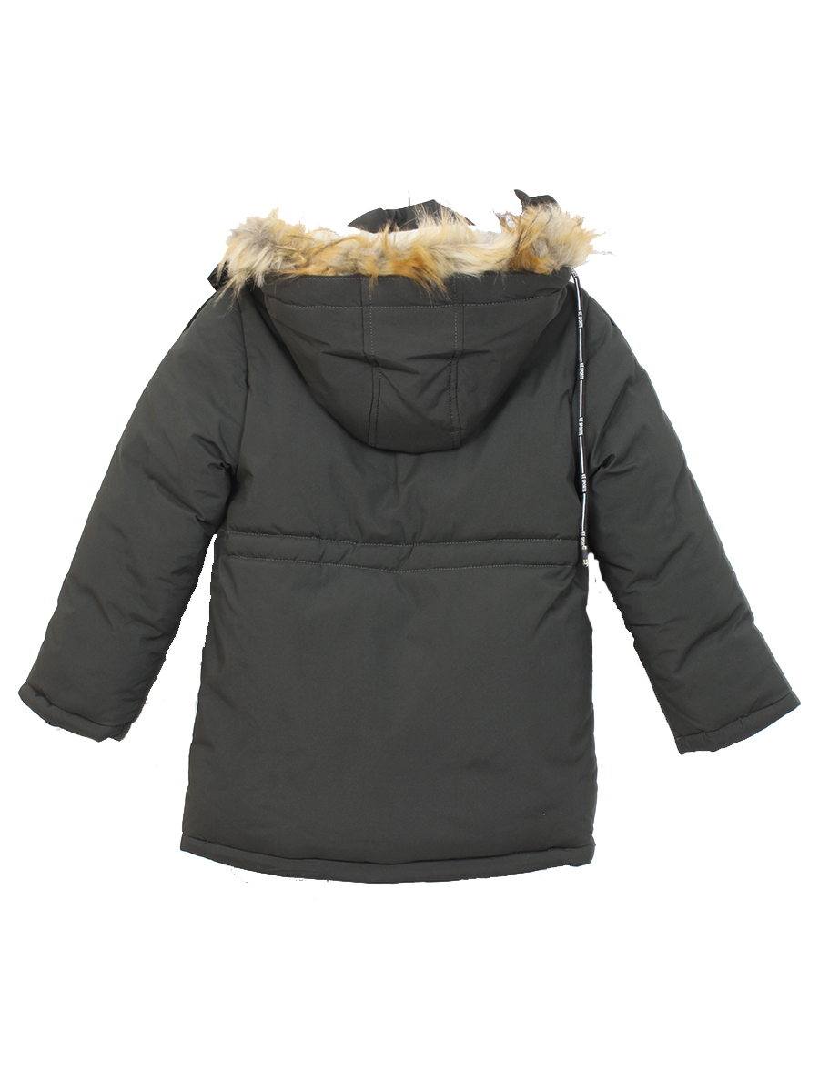Пуховик для мальчика с подкладом зимний с натуральным мехом. Есть карманы и капюшон. Стиль современный. Цвет темно-серый.