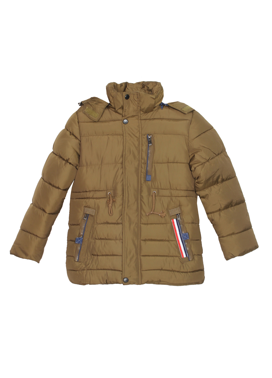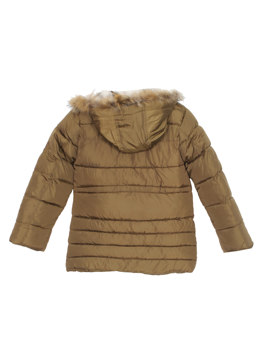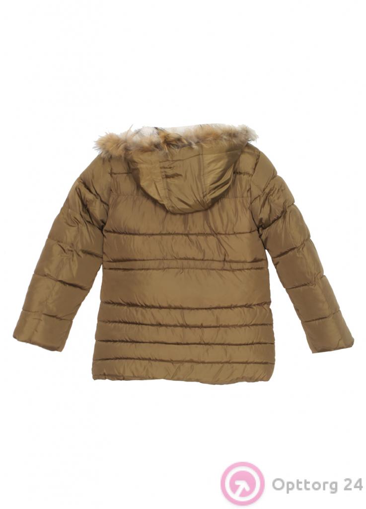 Подростковый пуховик необчного бежевого цвета. Изделие имеет воротник-стойку, три удобных кармана, застежку-молнию с защитной планкой и капюшон с натуральным мехом