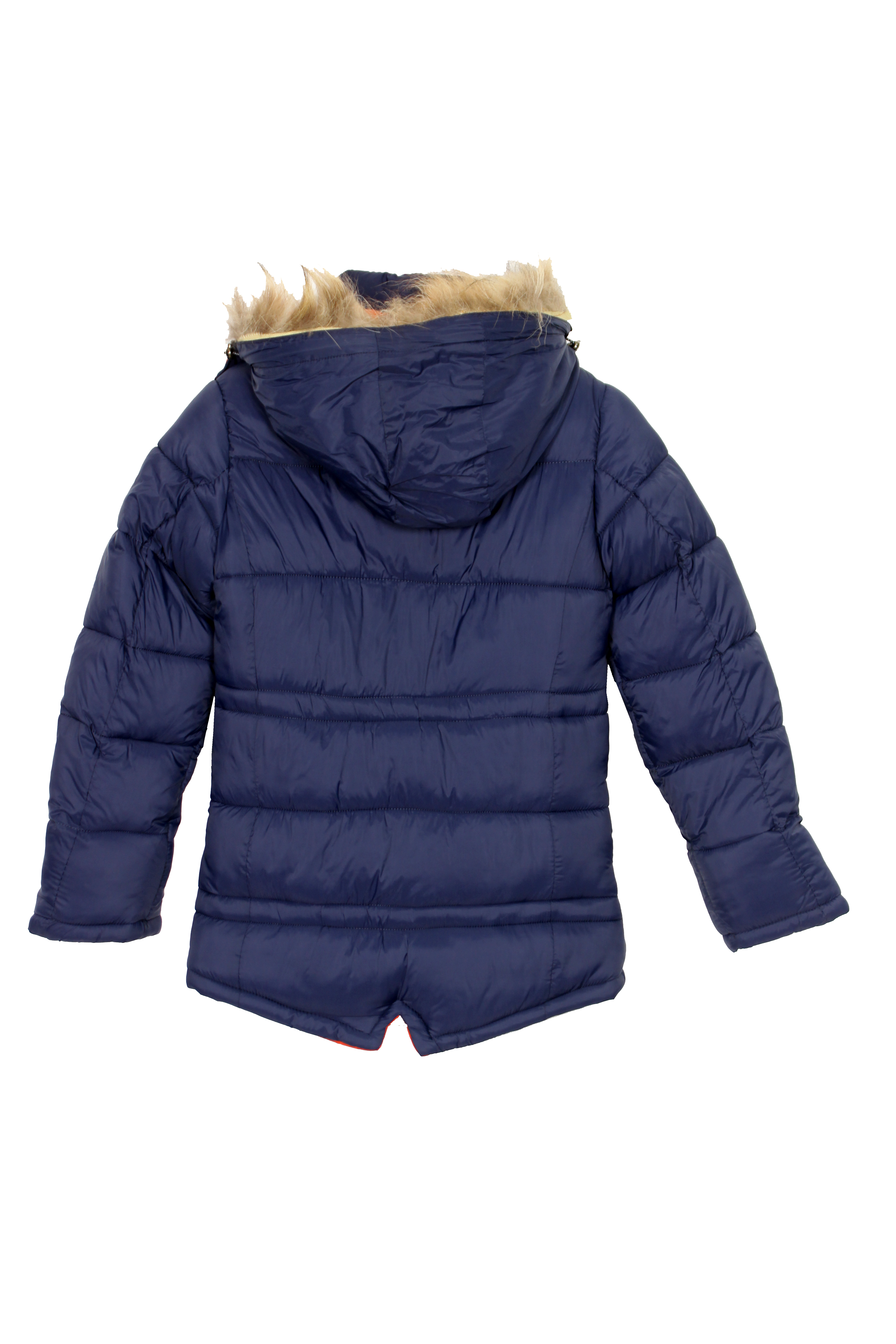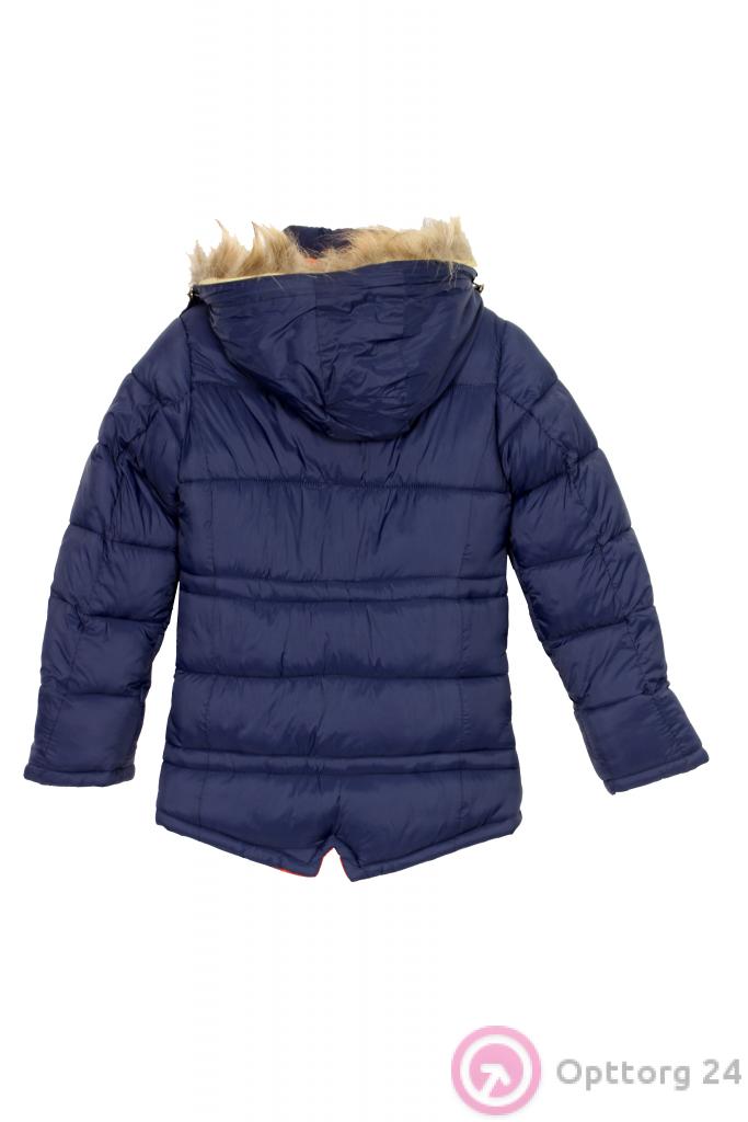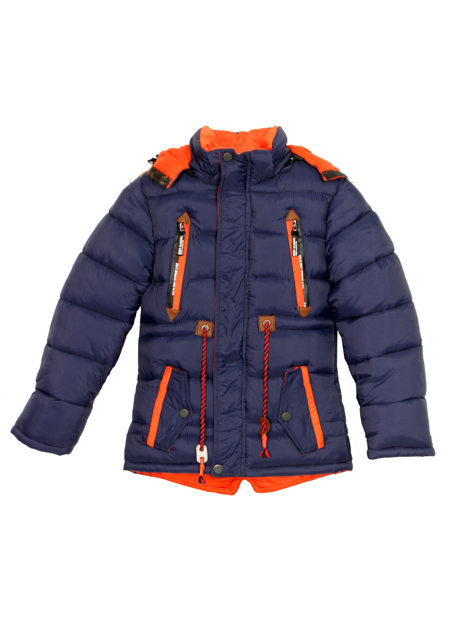 Симпотичный подростковый пуховик синего цвета с яркой оранжевой подкладкой. Имеет удлиненный крой на задней части, что дополнительно защищает поясницу от ветра, большие карманы и пояс на звязках