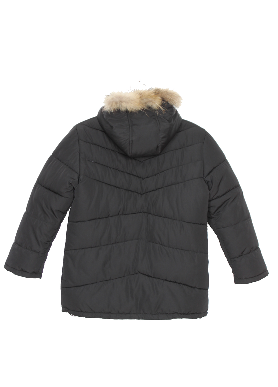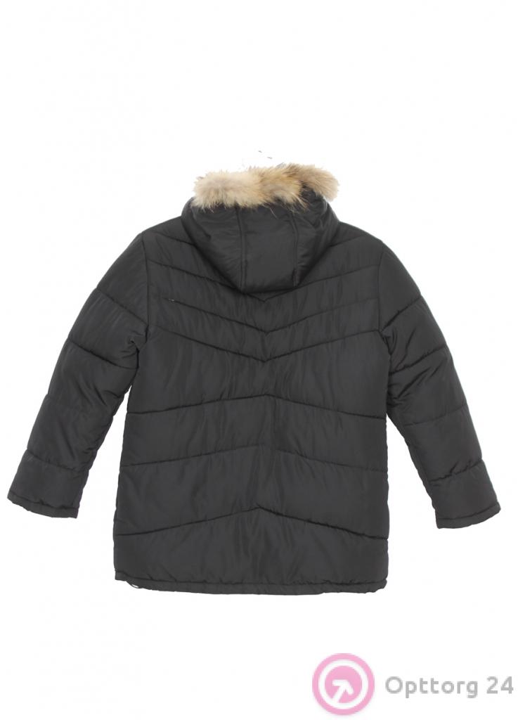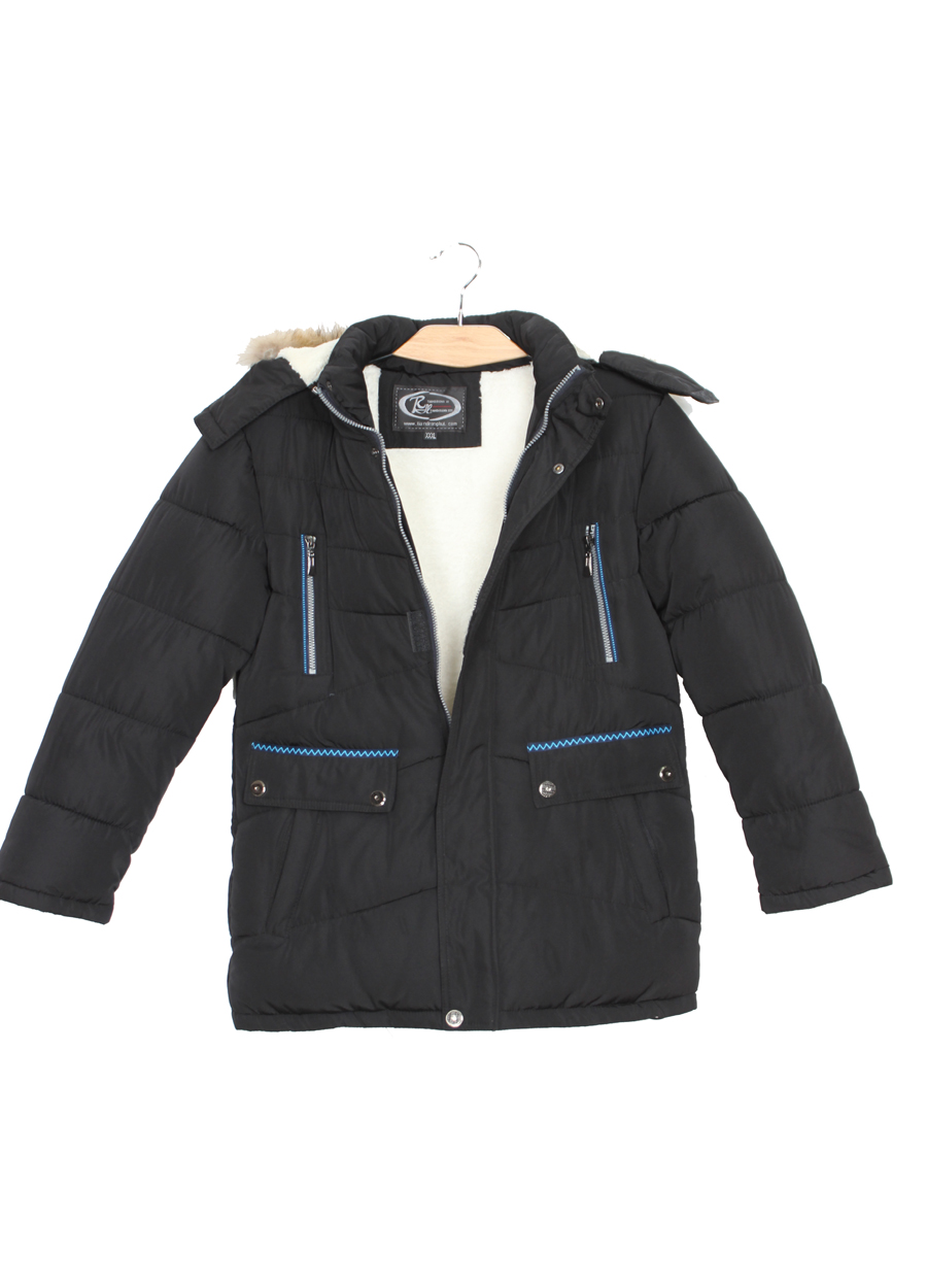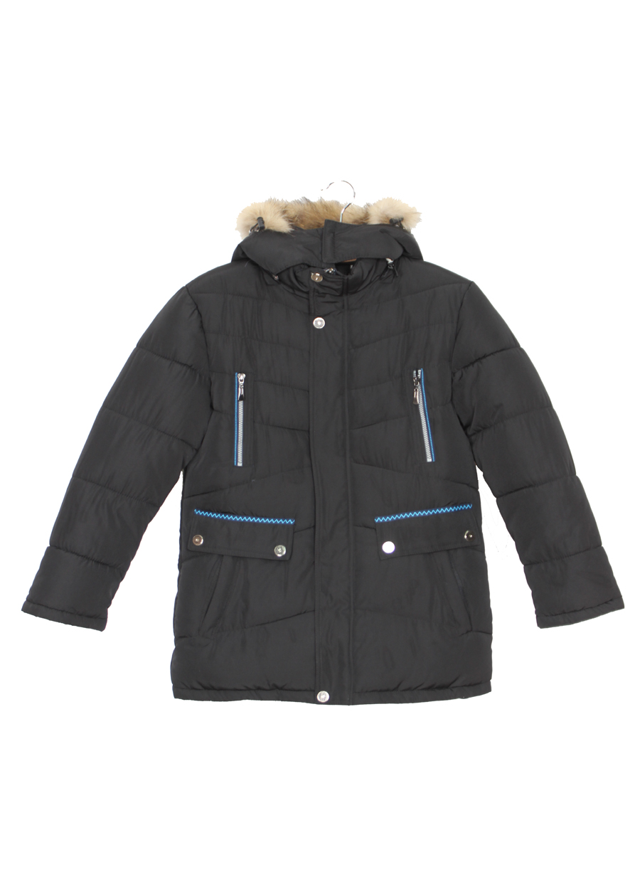 Подростковый пуховик черного цвета с модными вставками голубого цвета, четырьмя большими карманами. Изделие обладает капюшоном с мехом и на застежке
