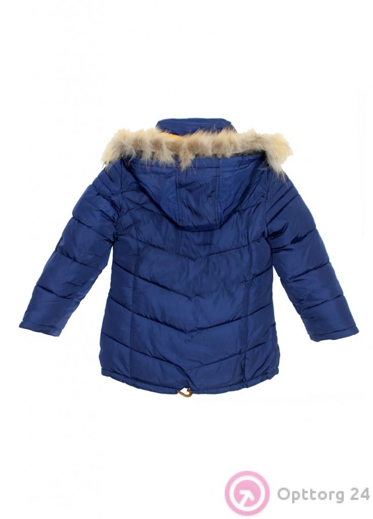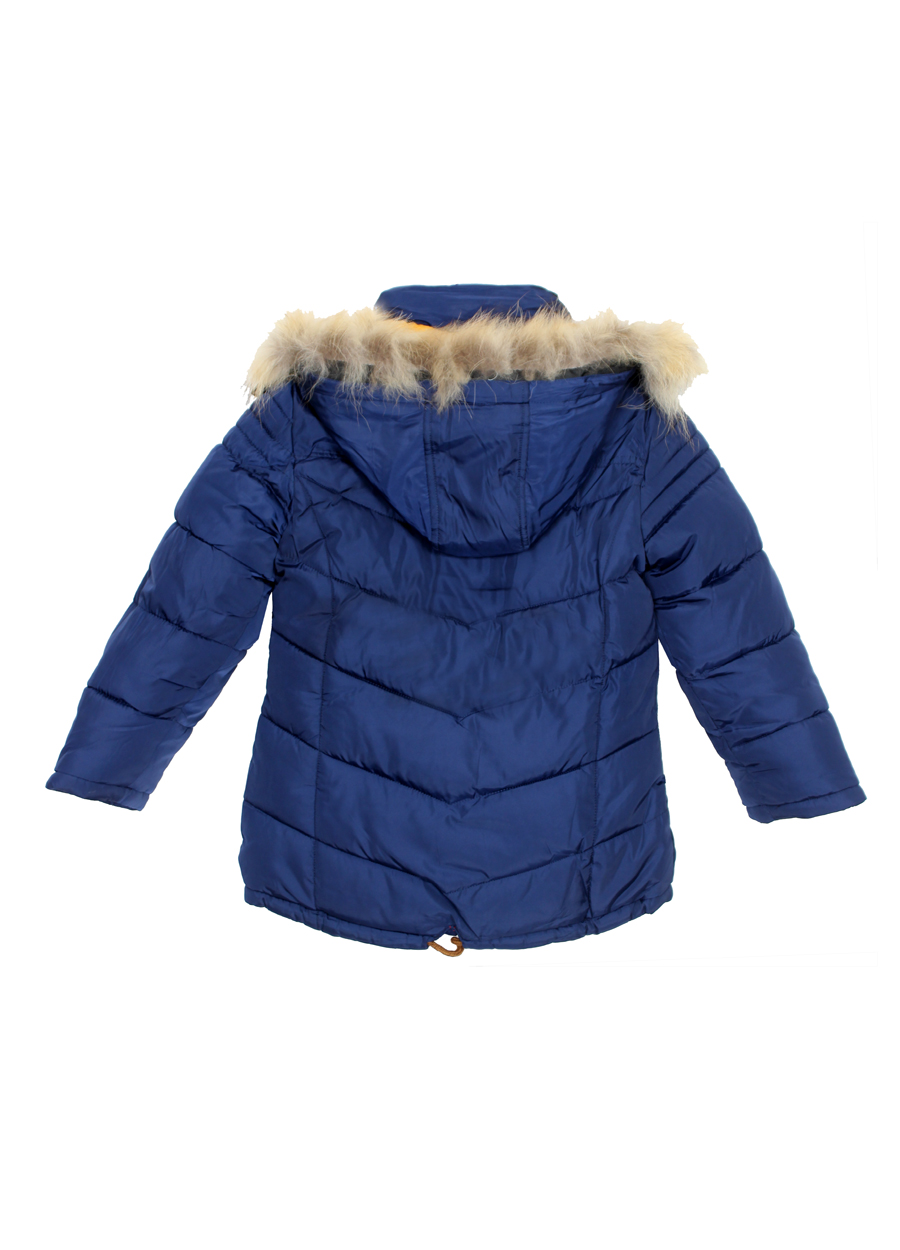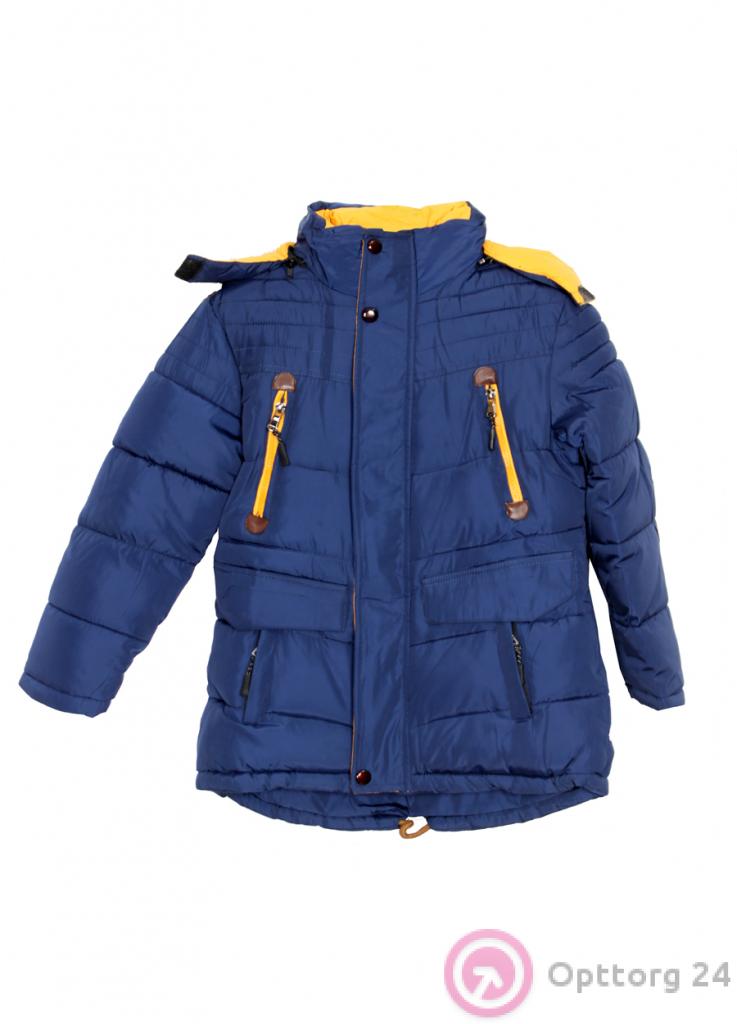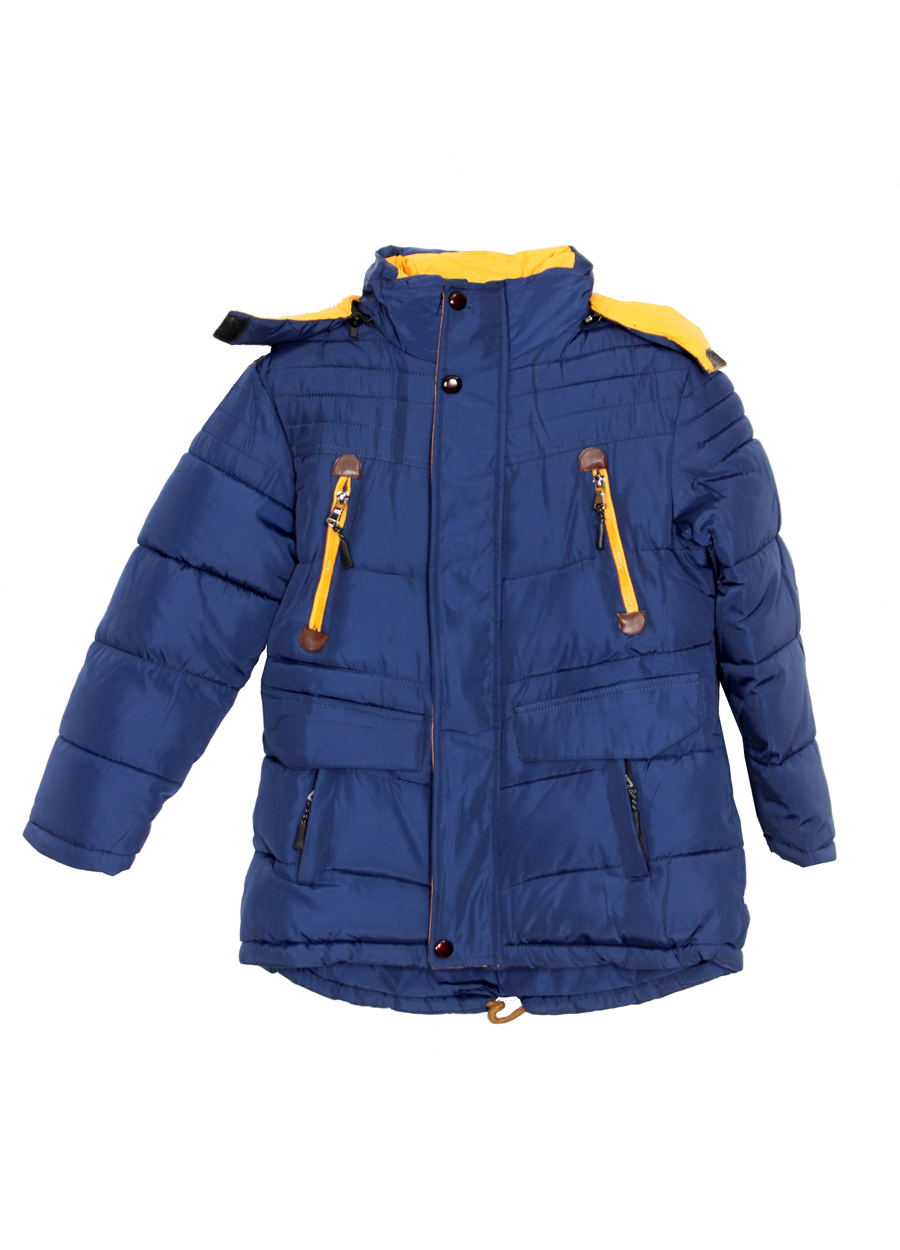 Теплый синий пуховик с желтой подкладкой и молниями на карманах. Практичный и комфортный, имеет удобный капюшон, воротник-стойку