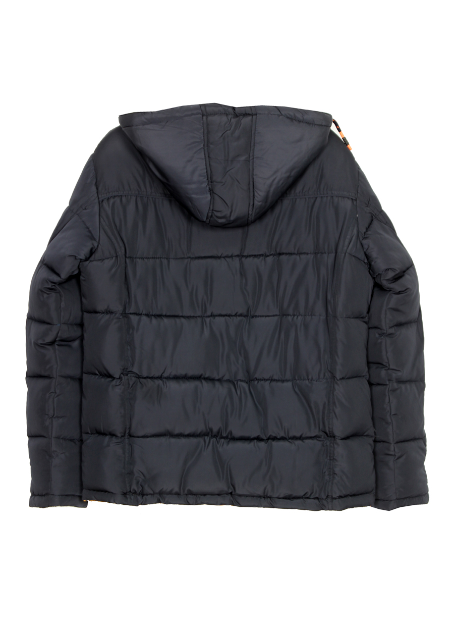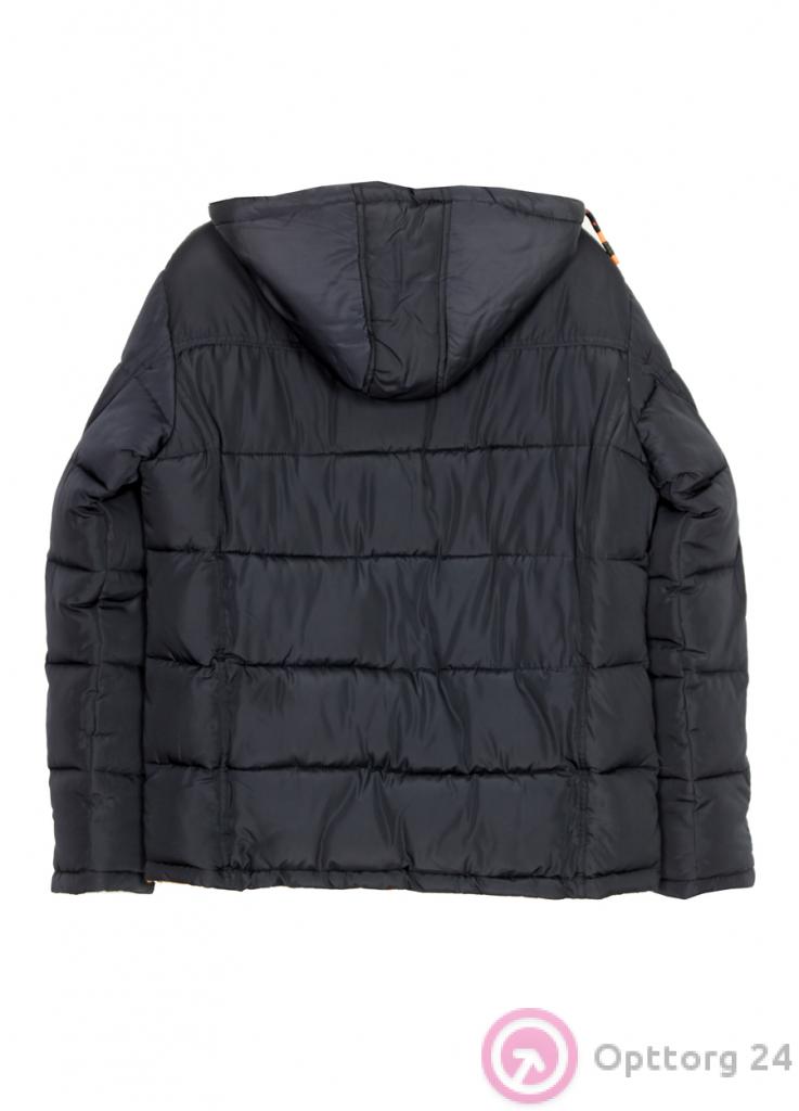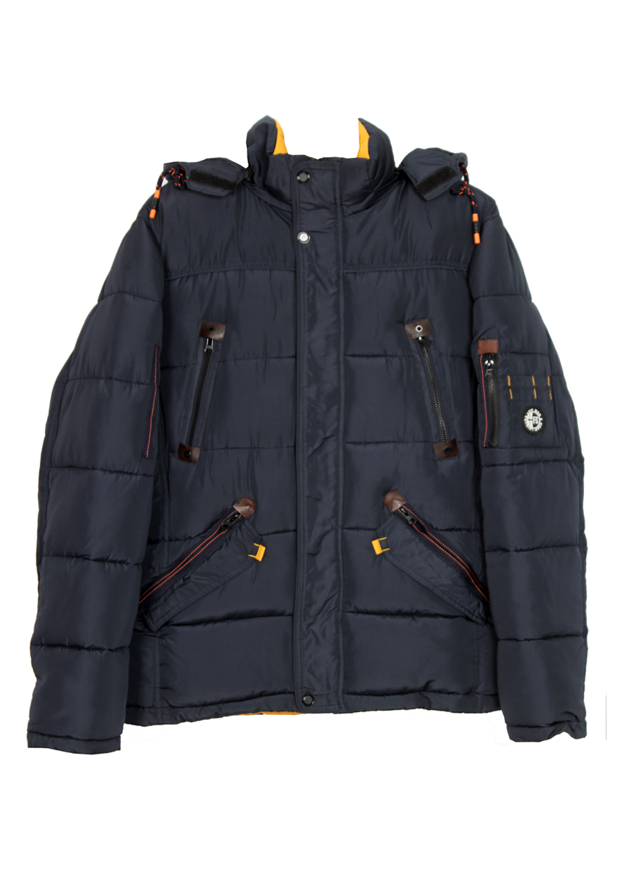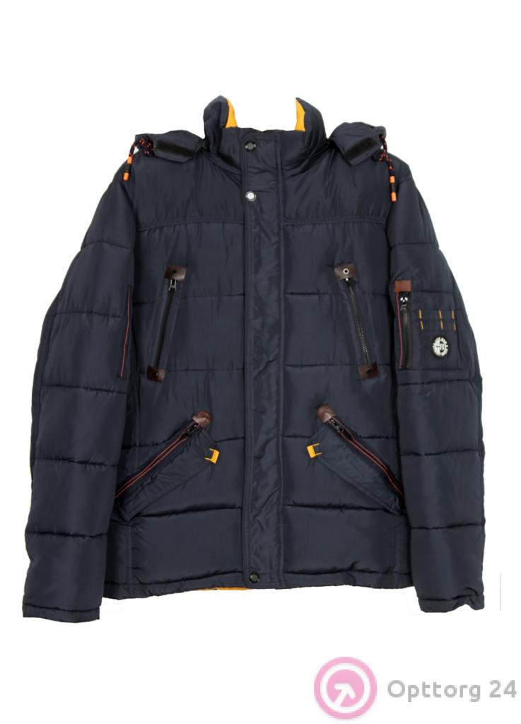 Подростковый пуховик в модном темно-синем цвете. Украшен красными линиями, имеет вместительные карманы, воротник-стойку и теплый капюшон