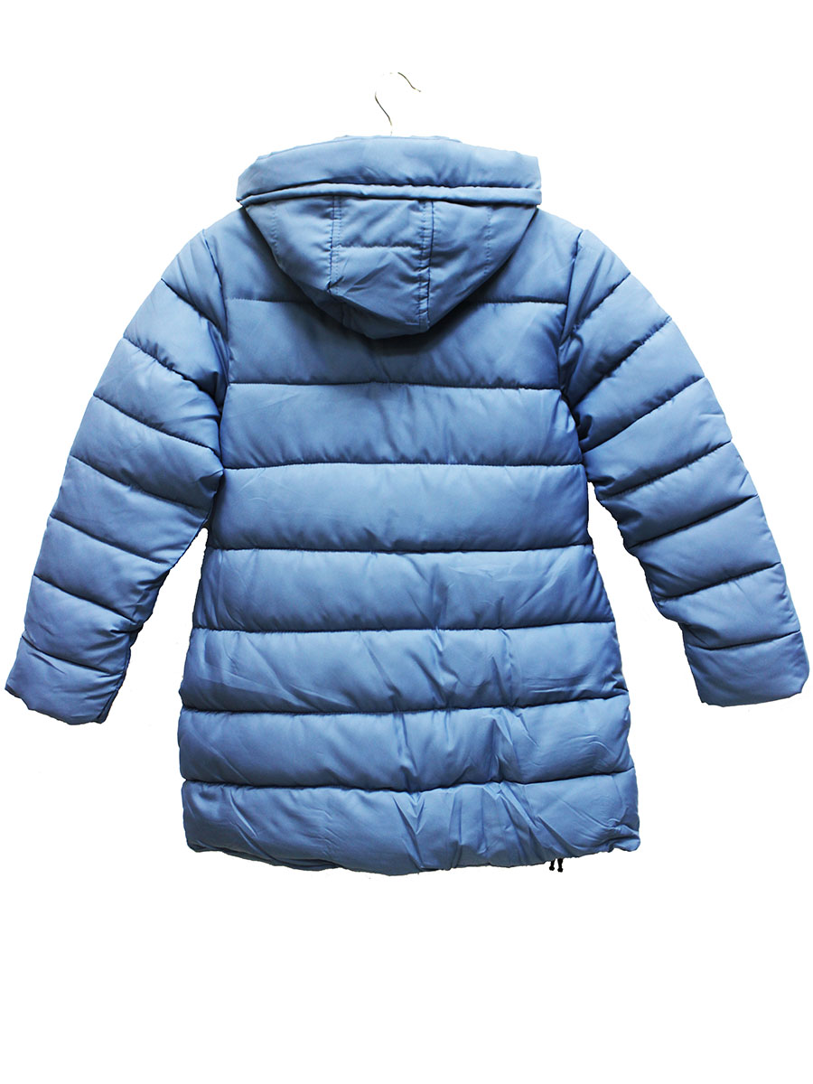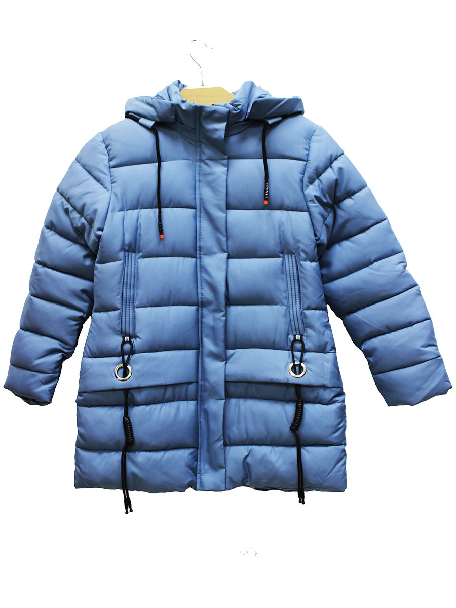 Пуховик зимний на девочку подростковый цвет синий. Изделие имеет два кармана на молнии и капюшон, карман декорирован шнурочками. Замок-молния. Температурный режим до -25-30.