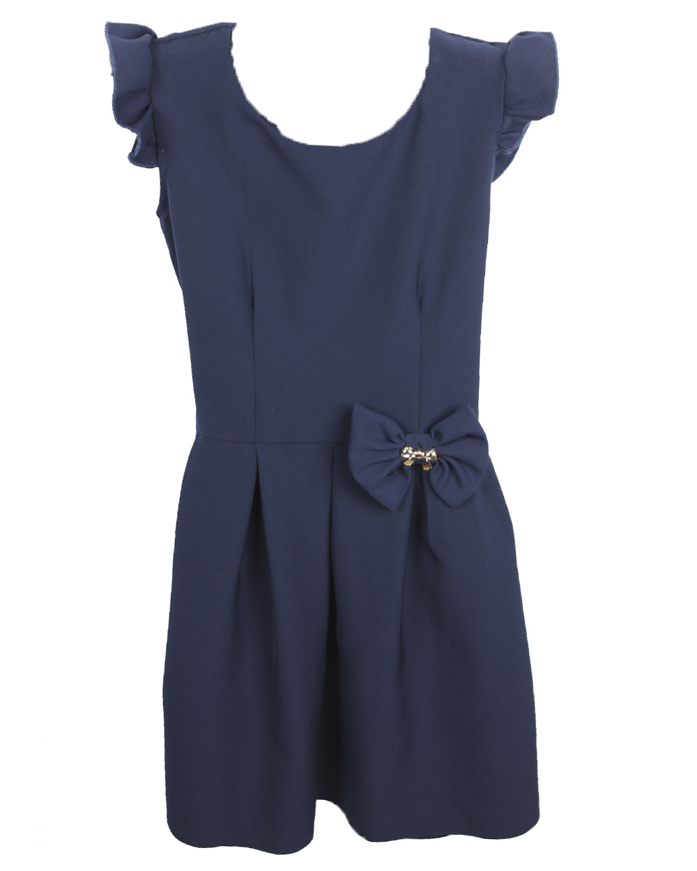 Детский сарафан с коротким рукавом. Модель тёмно-синего цвета украшена поясом.