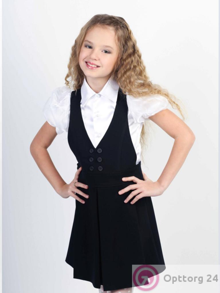 Детский школьный сарафан темно-синего цвета с вырезом в области груди.