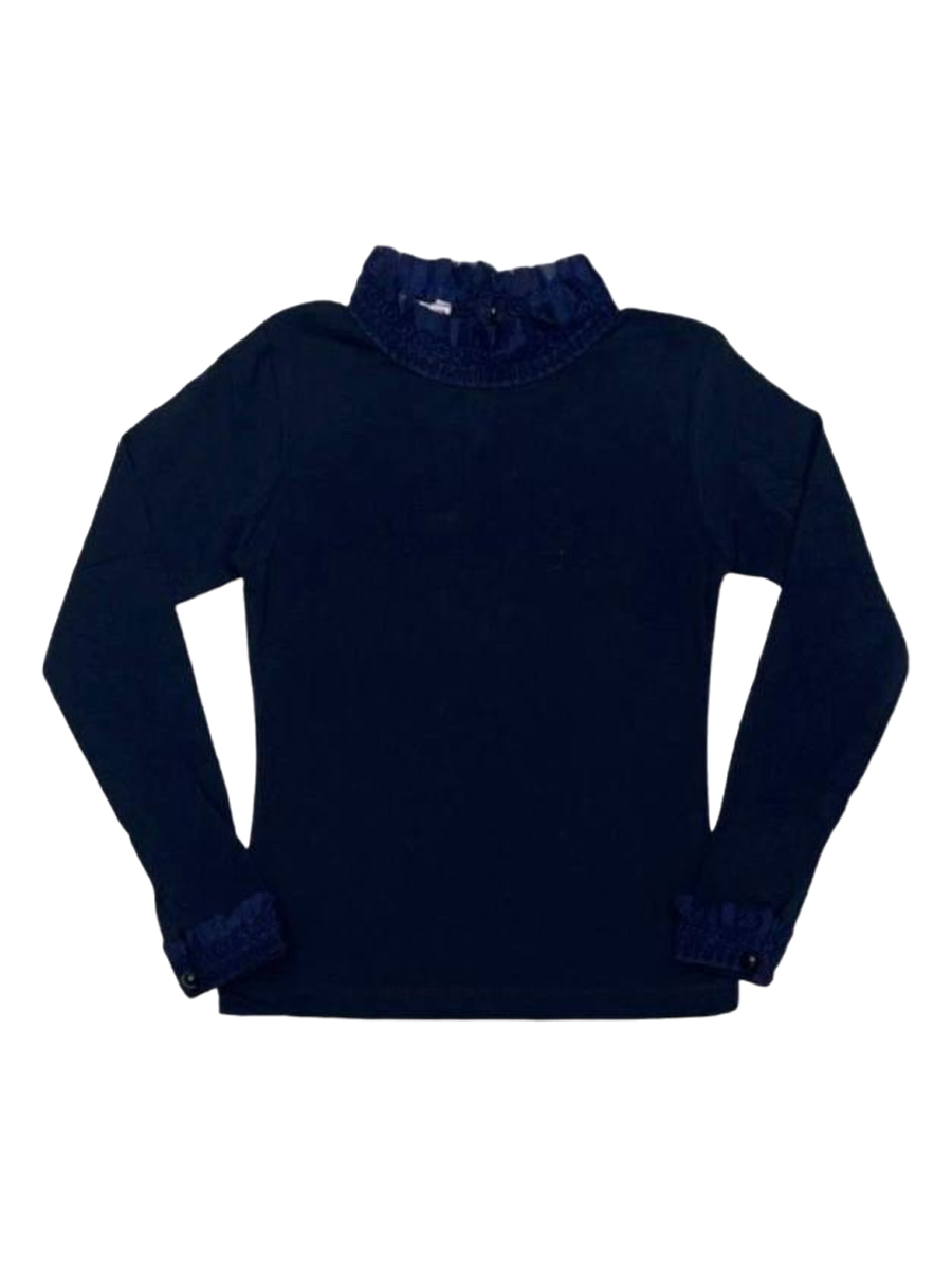Темно-синяя блузка для девочки, простой, но элегантный дизайн и прямой крой позволяет носить ее как с юбкой, так и с брюками, длинные рукава с манжетами, воротник стойка с оригинальной отделкой.