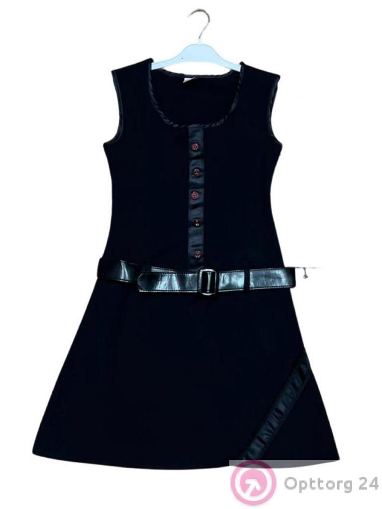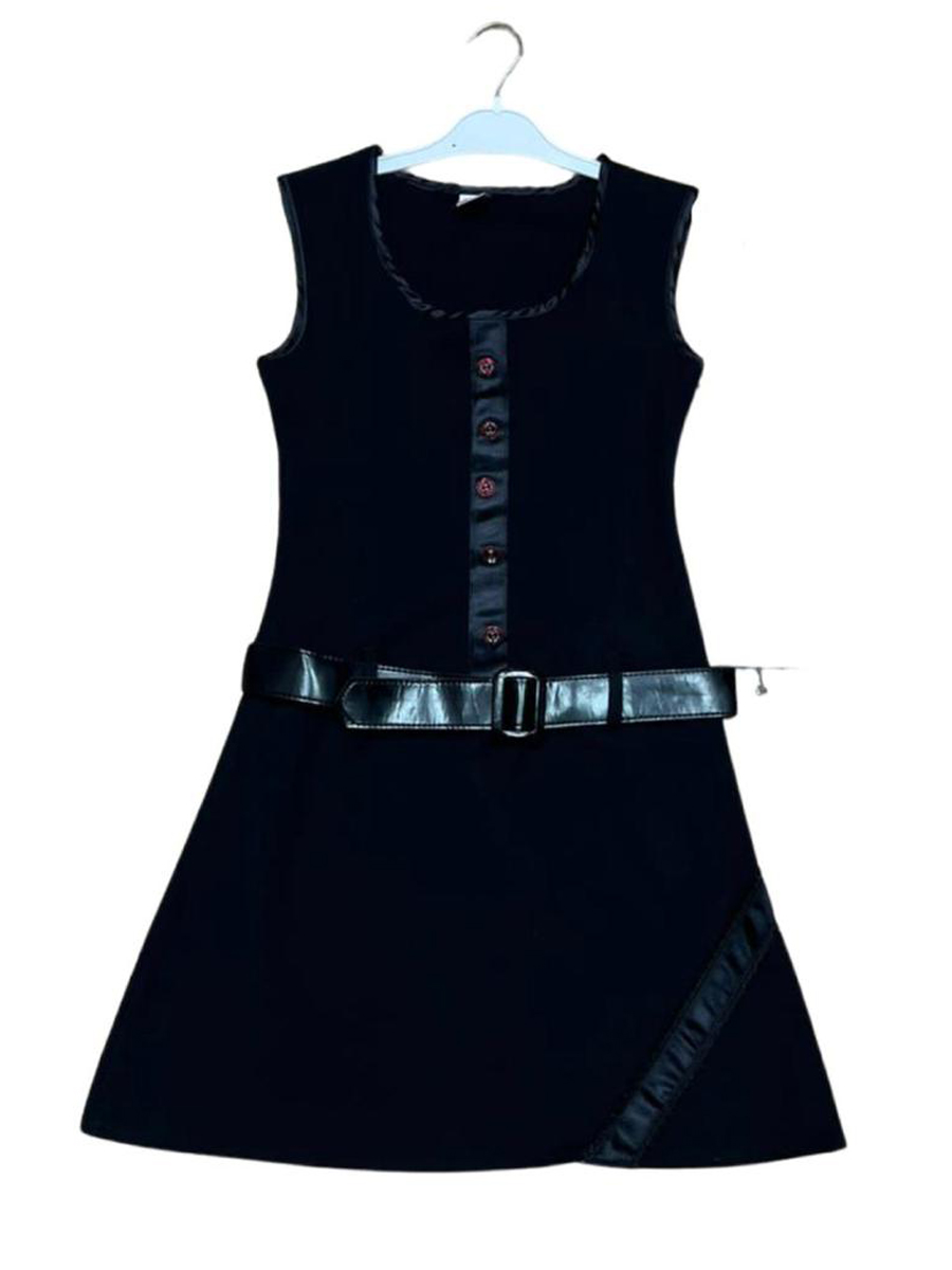 Приталенный школьный сарафан для девочки черного цвета, дополнен стильным широким поясом, расклешенная юбка, декорированная шелковой полосой, передняя планка с пуговицами, округлый вырез с кантом.