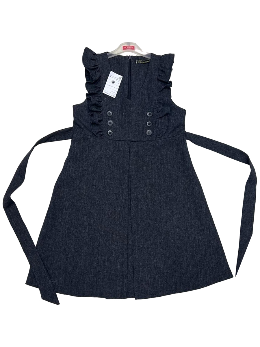 Темно-серый цвет делает его универсальным и позволяет сочетать с различными аксессуарами и обувью, в комплекте с сарафаном можно носить любого цвета блузку или футболку Пройма рукава отделана рюшами, расклешенная широкая юбка впереди со складкой, тканевый пояс хлястик, который можно завязать на бант как спереди, так и сзади, декорирован рюшами и пуговицами на груди в два ряда.