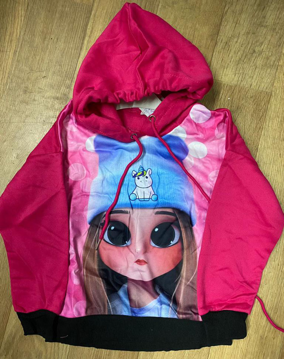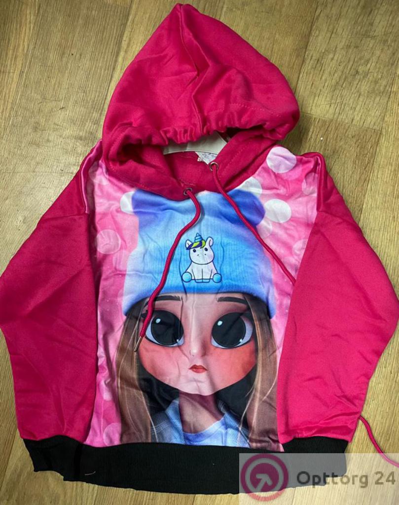 Описание: Толстовка детская для девочки с капюшоном. Выполнена с большим, красочным принтом на переднем плане. Манжеты рукавов и и низ толстовки на широкой трикотажной резинке.