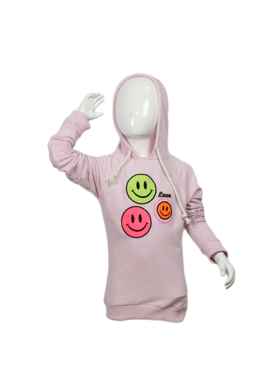 толстовка детскай с капюшоном бледно-розового цвета. Модель имеет спереди объёмный принт в виде 3-х смайликов, а так же объёмную надпись на груди слева.