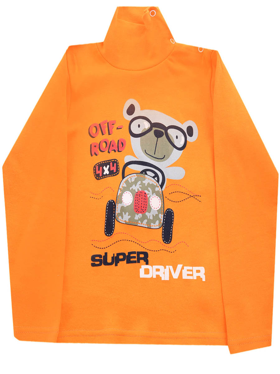 Водолазка детская для мальчика. модель оранжевого цвета с принтом на передней части изделия.